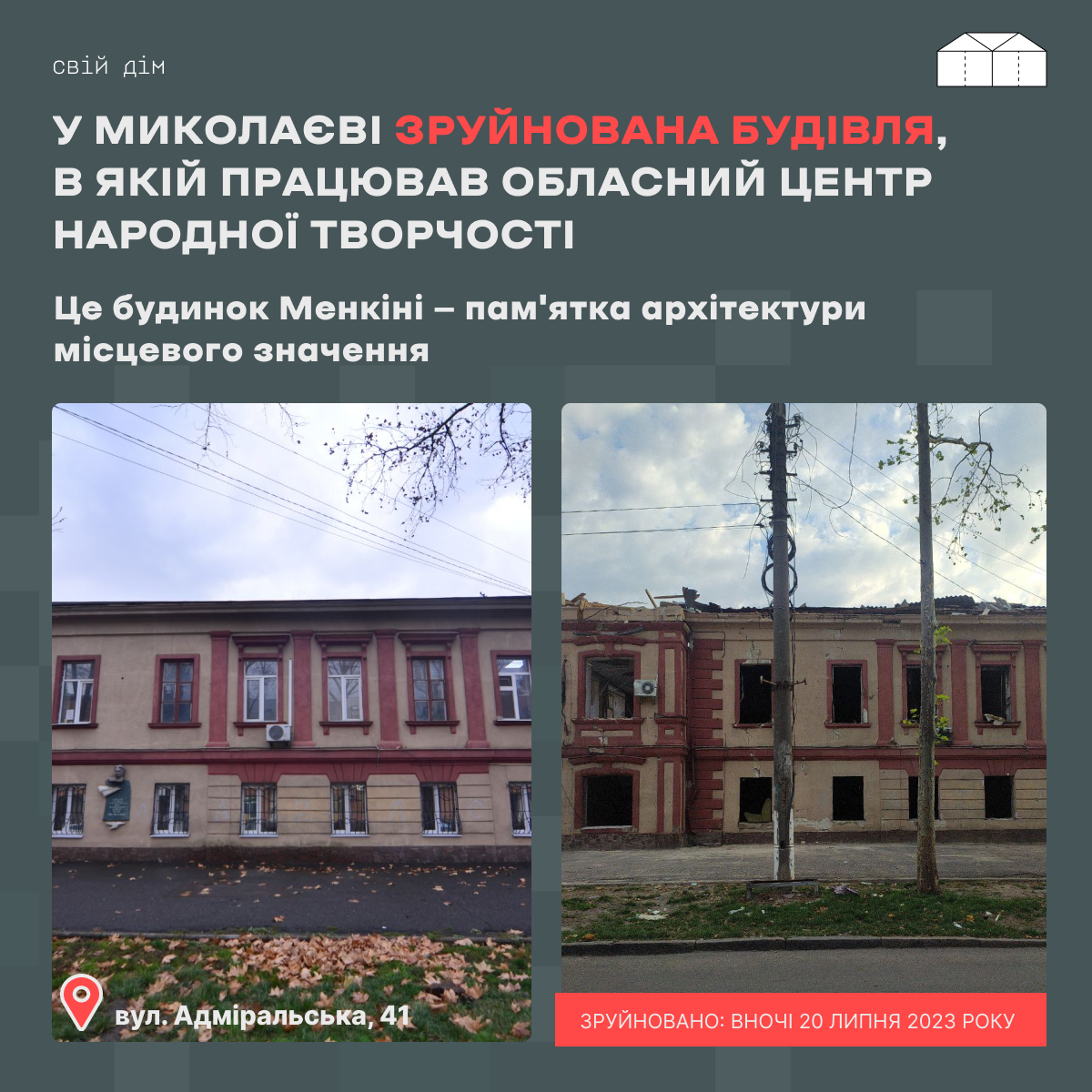 Вночі 20 липня 2023 року російські окупанти зруйнували історичну будівлю, в якій працював Миколаївський обласний центр народної творчості та культурно-освітньої роботи.