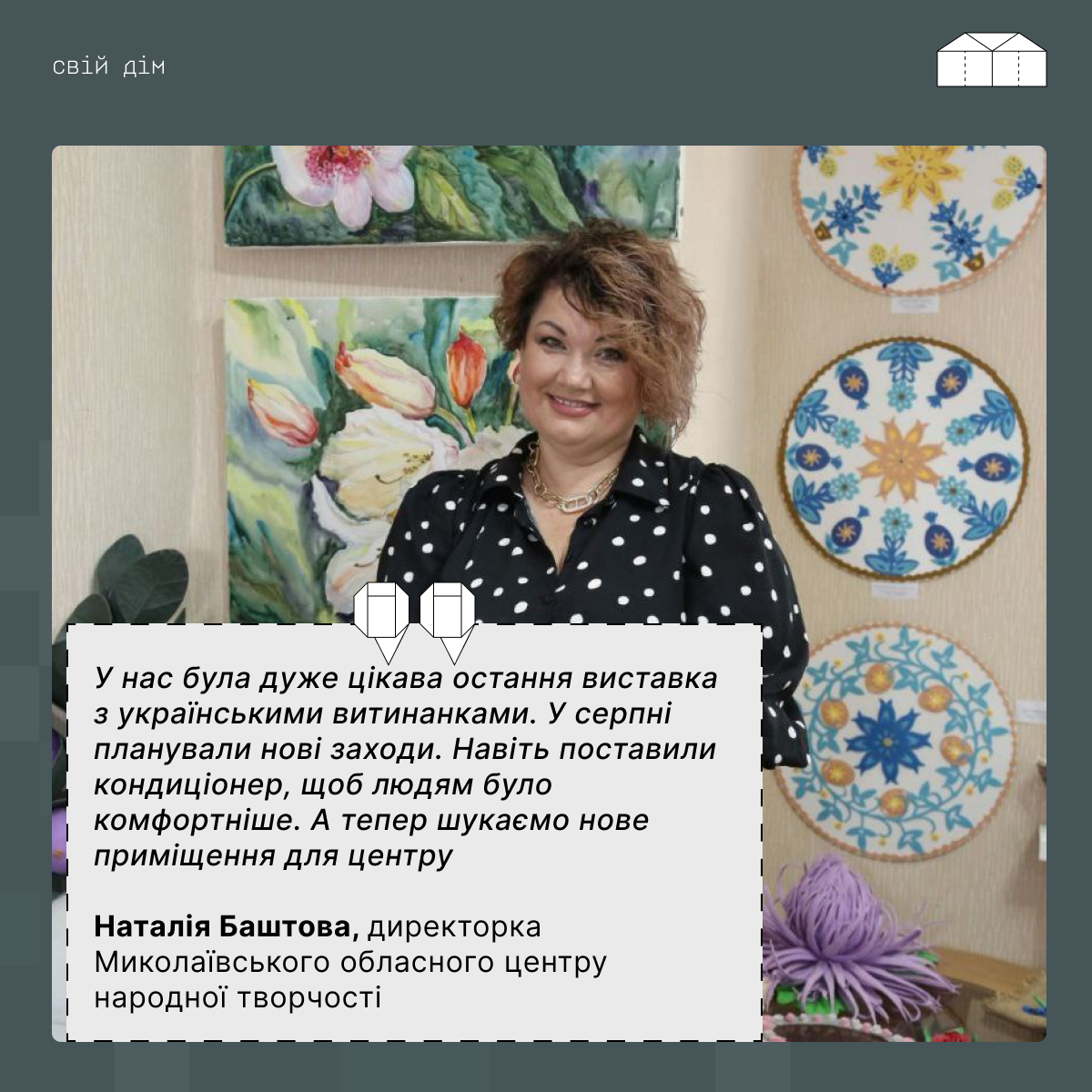 “Коли прийшли вранці, то побачили, що стін немає, даху немає, балки попадали. Було зрозуміло, що рятувати вже нічого. На столах, підлозі — всюди цегла. Важко було щось знайти. Винесли частину документації, колеги допомагали все вивозити”, — розповіла журналісту “Свій дім” Наталія Баштова, директорка Миколаївського обласного центру народної творчості, Заслужена артистка України.