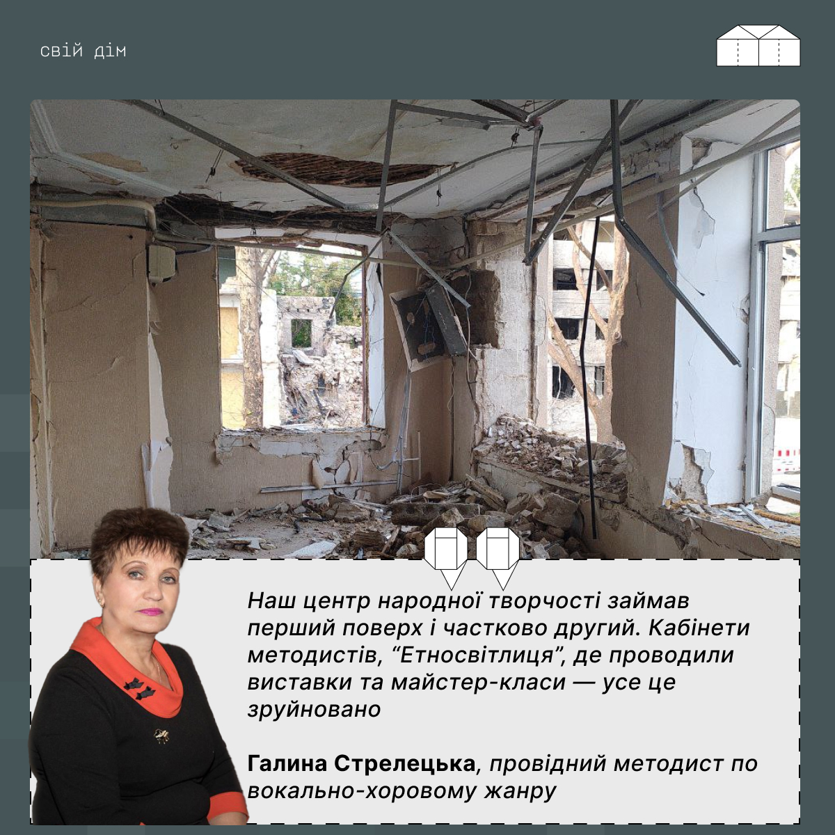 “У зруйнованій будівлі наш центр творчості займав практично весь перший поверх і частково другий. Були кабінети методистів, “Етносвітлиця”, де проводили виставки і майстер-класи”, — розповіла Галина Стрелецька, провідний методист по вокально-хоровому жанру.
