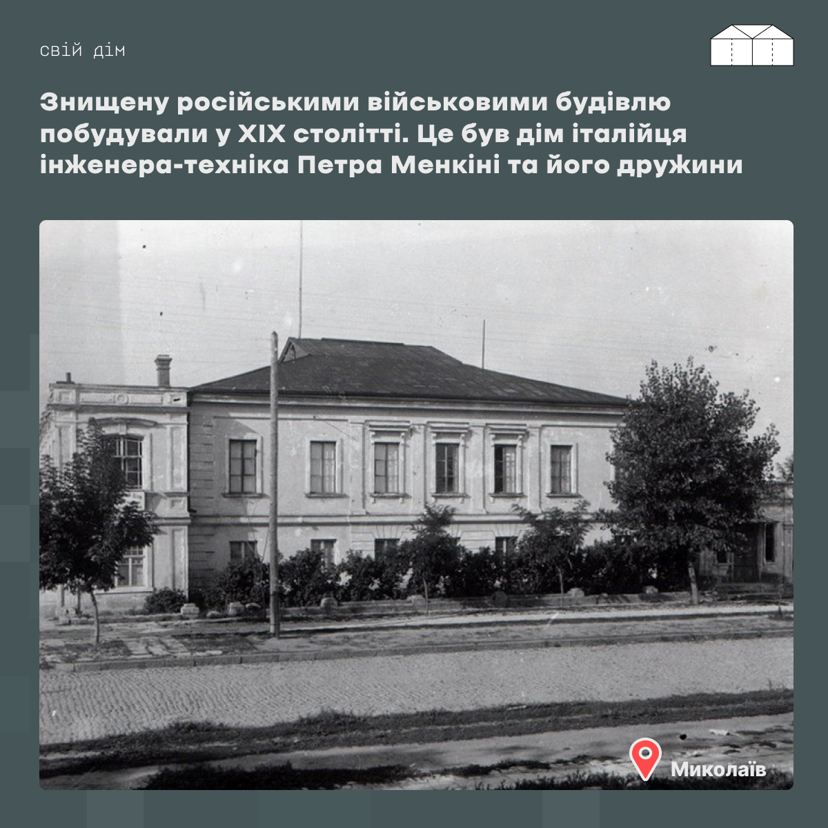 Це був будинок італійця Менкіні та його дружини. Свого часу вони приділяли багато уваги розв’язанню проблем міста й були відомими благодійниками. У березні 1916-го року подружжя подарувало краєзнавчим музеям Миколаєва та Херсона старожитності з власної колекції, у тому числі монети з дорогоцінних металів.