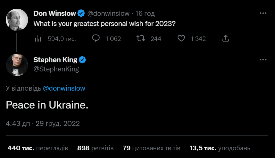 29 грудня американський письменник Дон Вінслоу запитав: “Яке ваше найпалкіше бажання на 2023 рік?”. У відповідь на цей твіт Стівен Кінг написав: “Мир в Україні”.