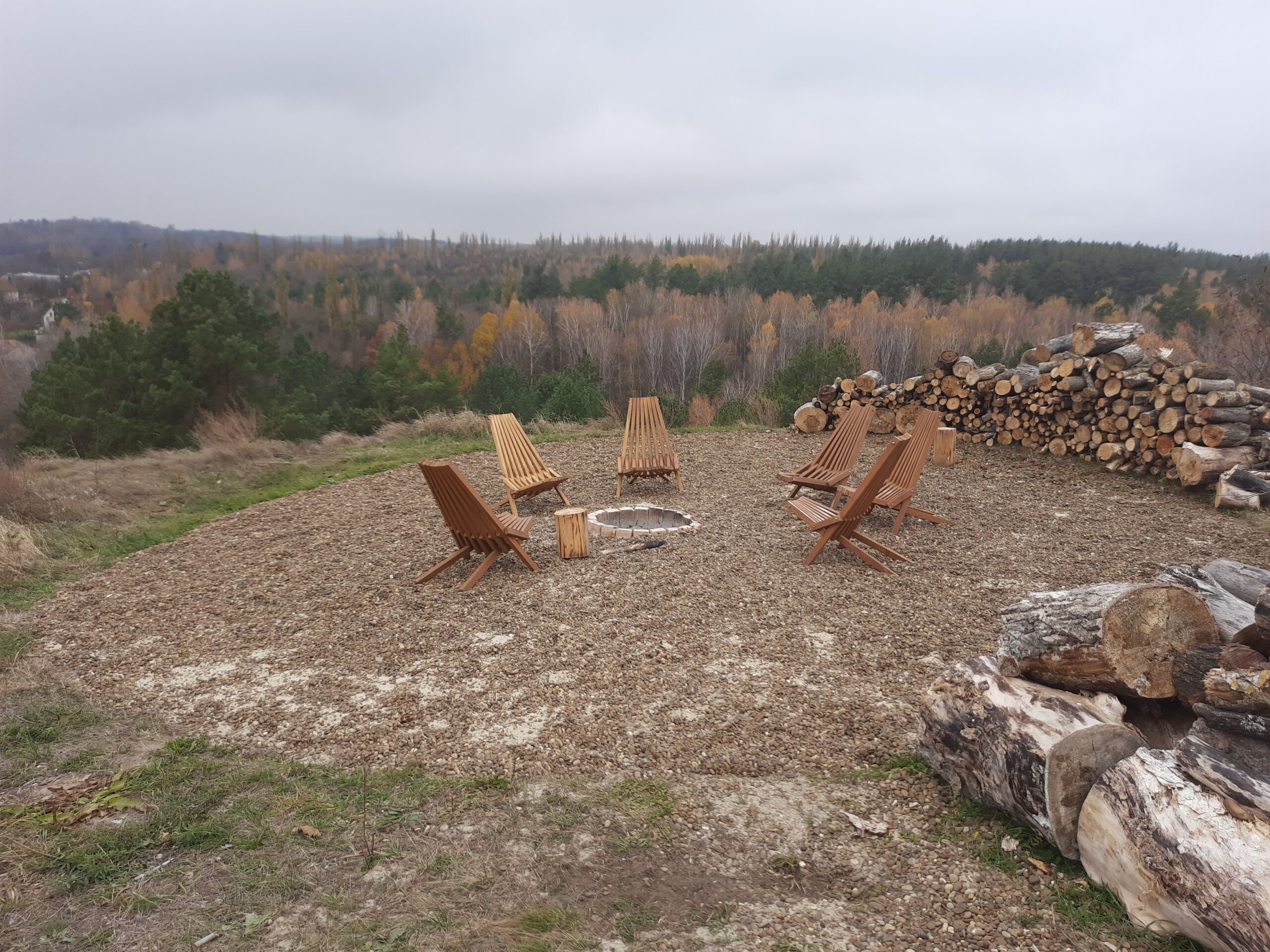 Місце для вогнища облаштували на пагорбі. Там лежать заготовлені дрова. Земля навколо багаття засипана річковою галькою. Для води пробурили свердловину. Каналізація — локальний септик із фільтрами.