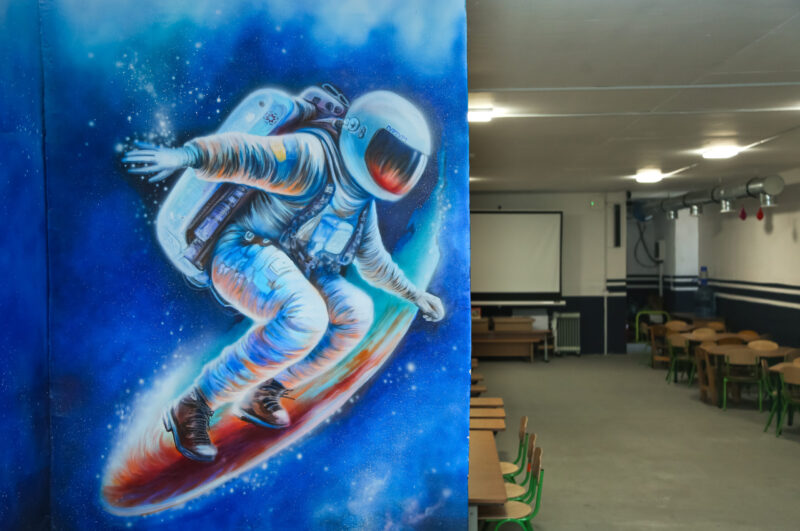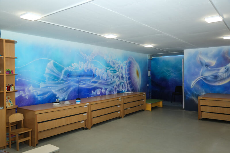 Окремої уваги заслуговує художнє оформлення — стіни розписані вручну, аби простір не асоціювався у дітей із традиційними сирими підвалами, а викликав позитивні емоції та відчуття безпеки.