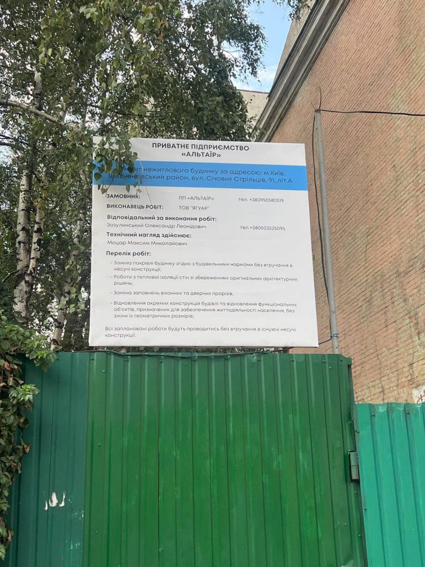 Департамент територіального контролю міста Києва видав картку на ремонт будинку. Згідно з проєктом, мали замінити покрівлю, провести теплоізоляцію, замінити двері й вікна, відновити окремі конструкції будівлі та функціональні об’єкти. Підрядником робіт є ТОВ “Ягуар”.