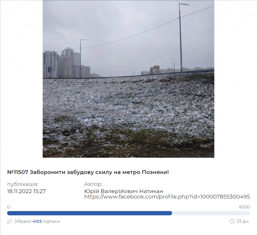 Ще у листопаді Юрій Натикан створив петицію, в якій закликає заборонити забудову схилу на метро Позняки.