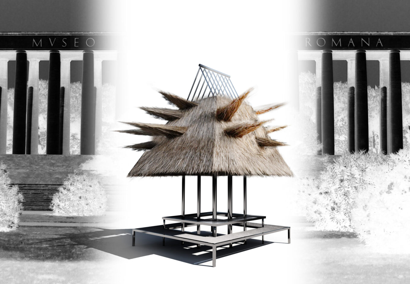 ДАХ II розташована просто неба між фасадом музею Museo della Civiltà та обеліском Марконі — бетонно-мармуровим монолітом 1940–1960-х років, який імітує давньоєгипетський техену. Інсталяція створена зі сталі й соломи. Метал символізує ракети й уламки, що падають з неба, металеві листи, які використовують для тимчасового відновлення житла, а також безпілотники, які захищають українське небо, створюючи ще один дах над дахами — купол із дронів. Солома, укладена у клиноподібні форми, надає об’єкту оборонної пози. Не за вибором, а через необхідність.