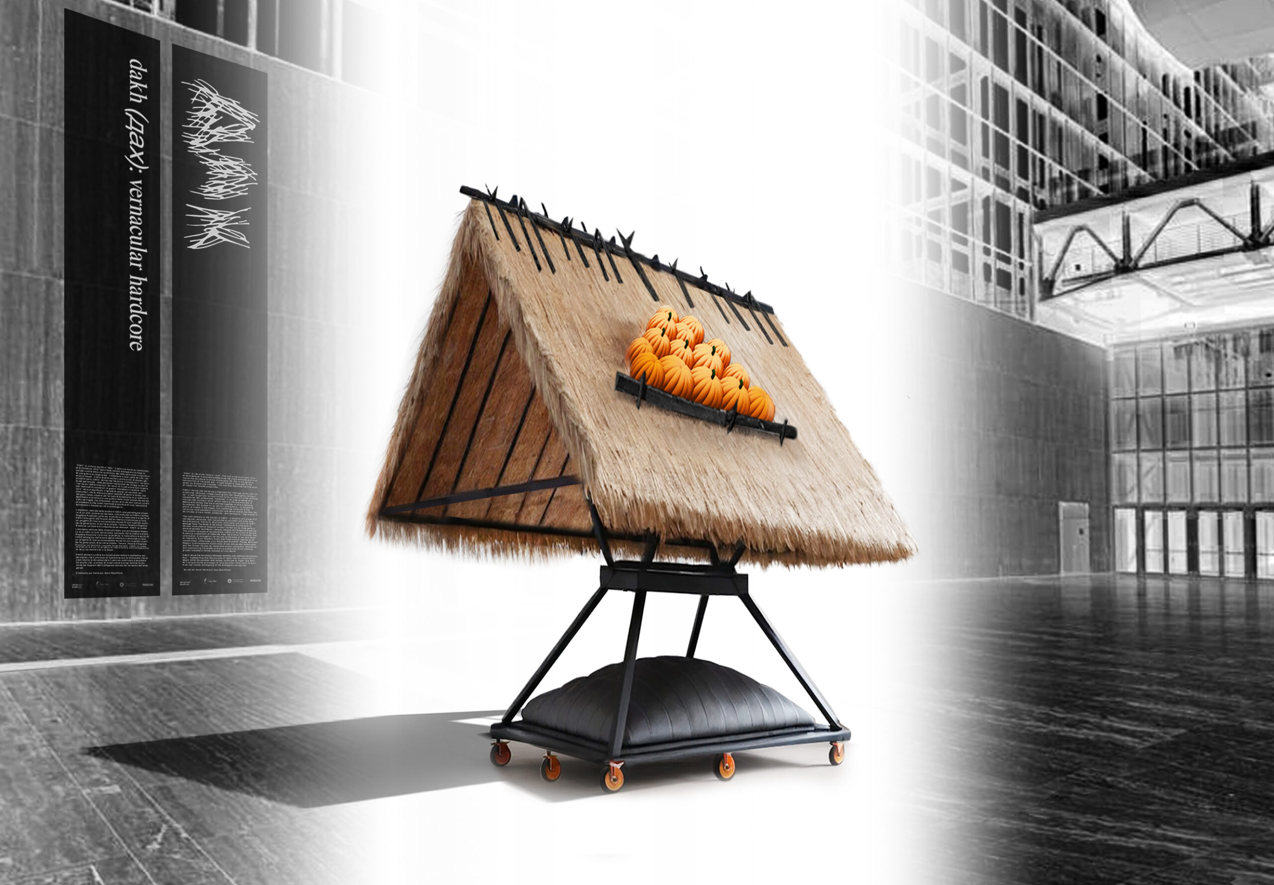 ДАХ III розташований у транзитному просторі виставкової зали — своєрідному “не-місці”, через яке проходять делегати конференції. Об’єкт стоїть на колесах, бо хоч і вкорінений у спадщину та спільноту, Дах залишається вразливим до атак і переміщень. Та попри нестабільність, на соломі залишені гарбузи — щоб дозріти й увібрати смак.