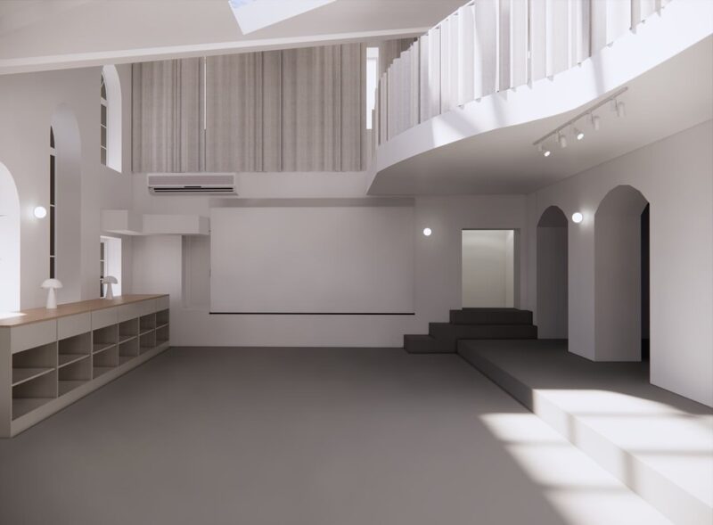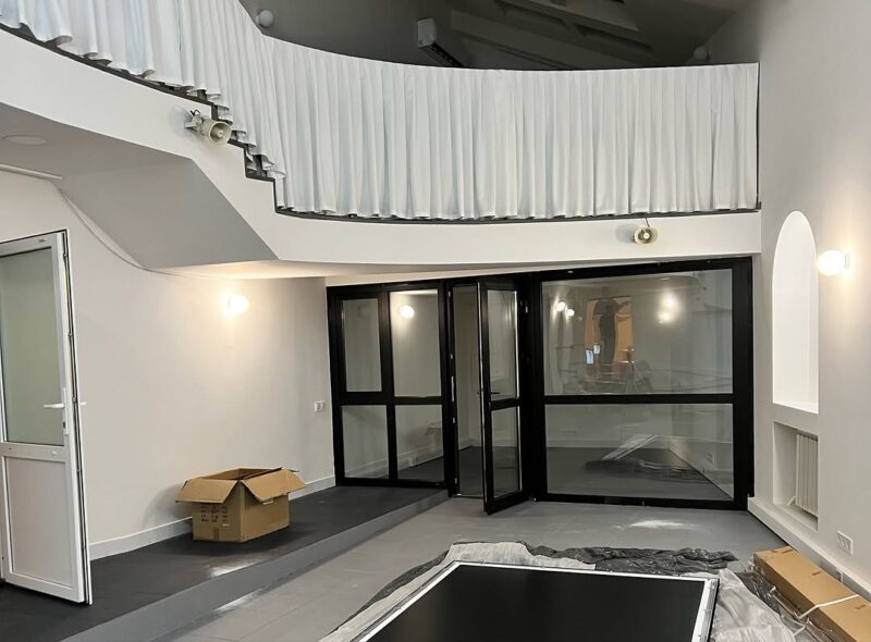 Над мінімалістичним оформленням галереї працювала дизайнерка Інна Дардалан. Тут є великий скляний дах, другий рівень з балюстрадою, а стінах – аркові ніші, що додають візуальної глибини. Чорні скляні двері додають контрасту, а за допомогою точкового освітлення вирішили робити акцент на важливих деталях, кажуть у команді.