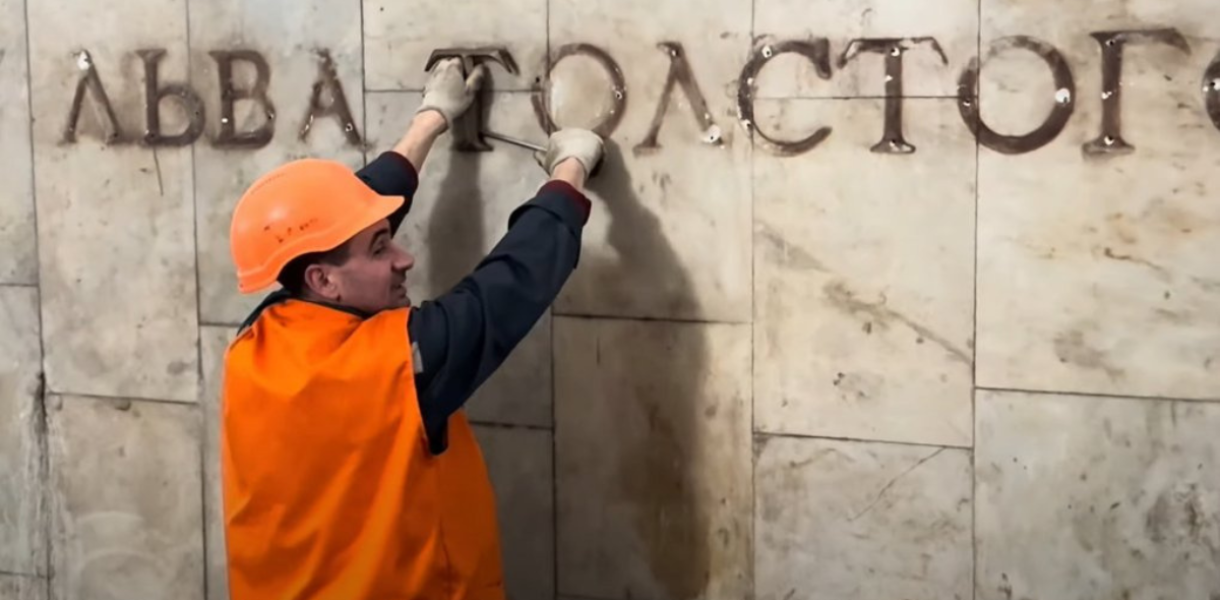 На станції метро “Площа Українських Героїв” з колійних стін демонтували стару назву “Площа Льва Толстого”.