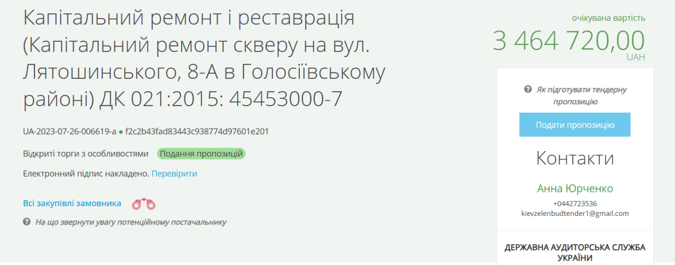 Капремонт планують провести у сквері біля Іподрому по вул. Лятошинського, 8-А. Замовником є КП “Київзеленбуд”.