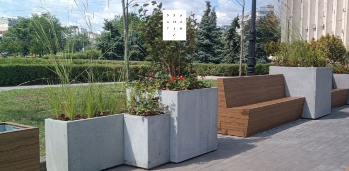 Простір доповнили дерев’яними конструкціями з озелененням.