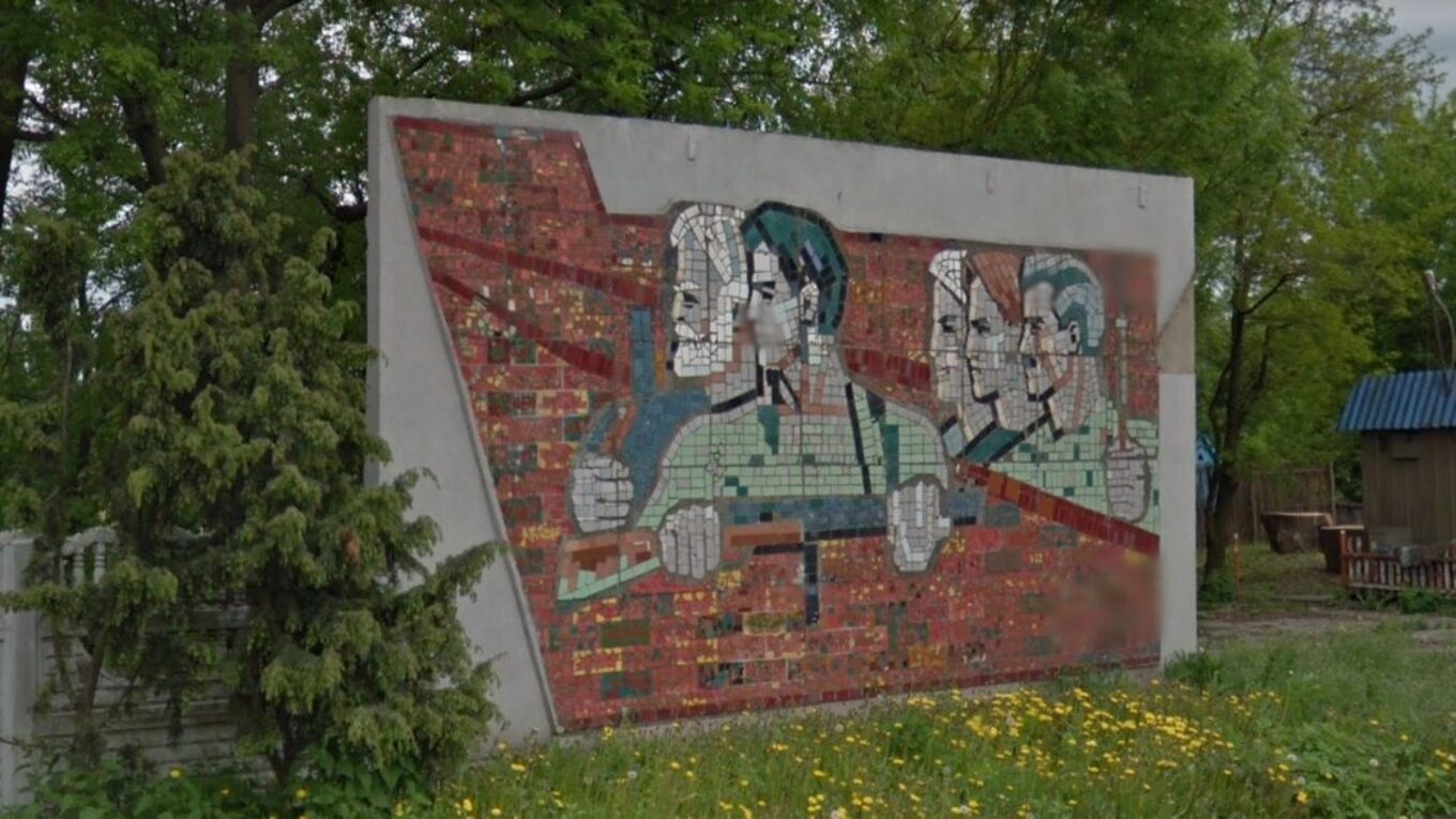 Авторство мозаїки біля стели наразі не встановлене, однак зображений сюжет притаманний саме рядянській добі – профілі представників пролетаріту в робочій формі з інструментами в руках.