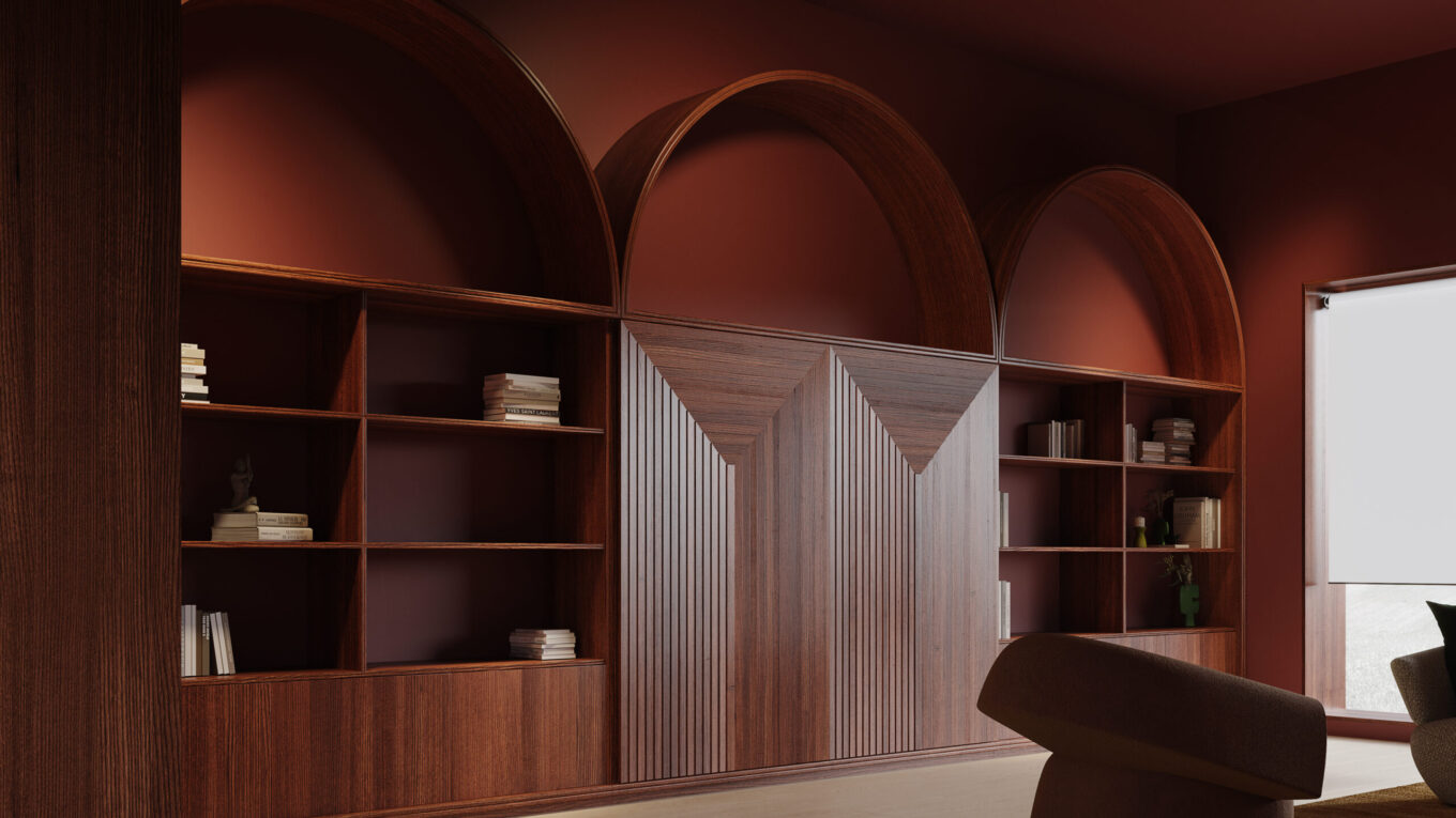 Яна Молодих: Мій перший предмет, що увійшов до колекції Mid-Century Modern, народився окремо від неї. Я декорувала проєкт, де замість стандартної ТВ-тумби у зоні відпочинку мав бути книжковий стелаж з інтегрованим домашнім кінотеатром і тумбами для зберігання.