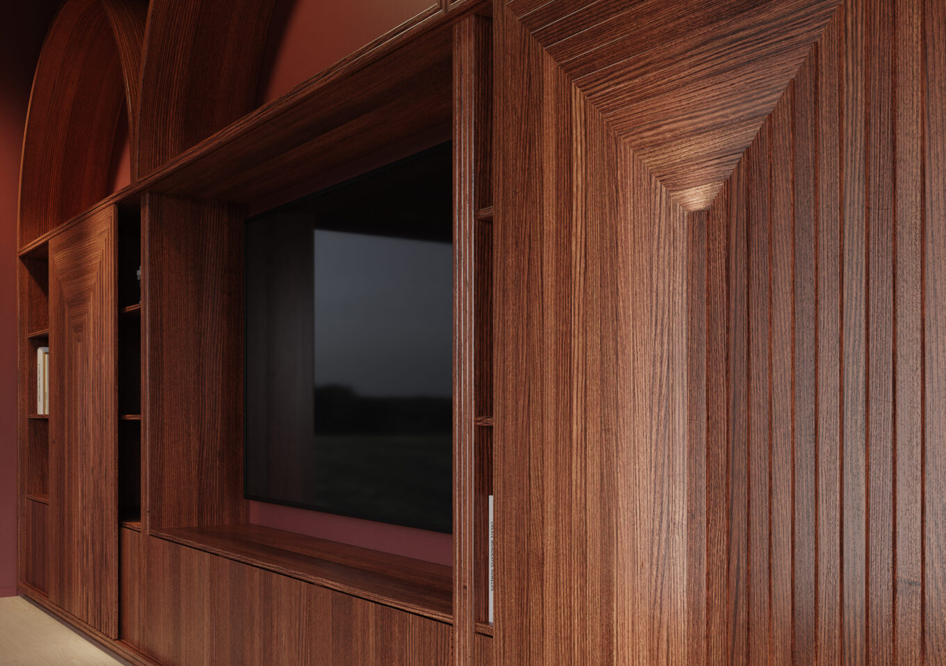 Зробила креслення та візуалізацію стелажа, а YourFoRest розробляли його як предмет. Вони запропонували кілька варіантів оформлення розсувних панелей, за якими ховався телевізор. Усе вийшло дуже вдало, і Юлія Корельська запропонувала колаборацію — поставити цей предмет до їхньої колекції Mid-Century Modern. Так з’явився стелаж ARC, а невдовзі до нього додався і мій столик.