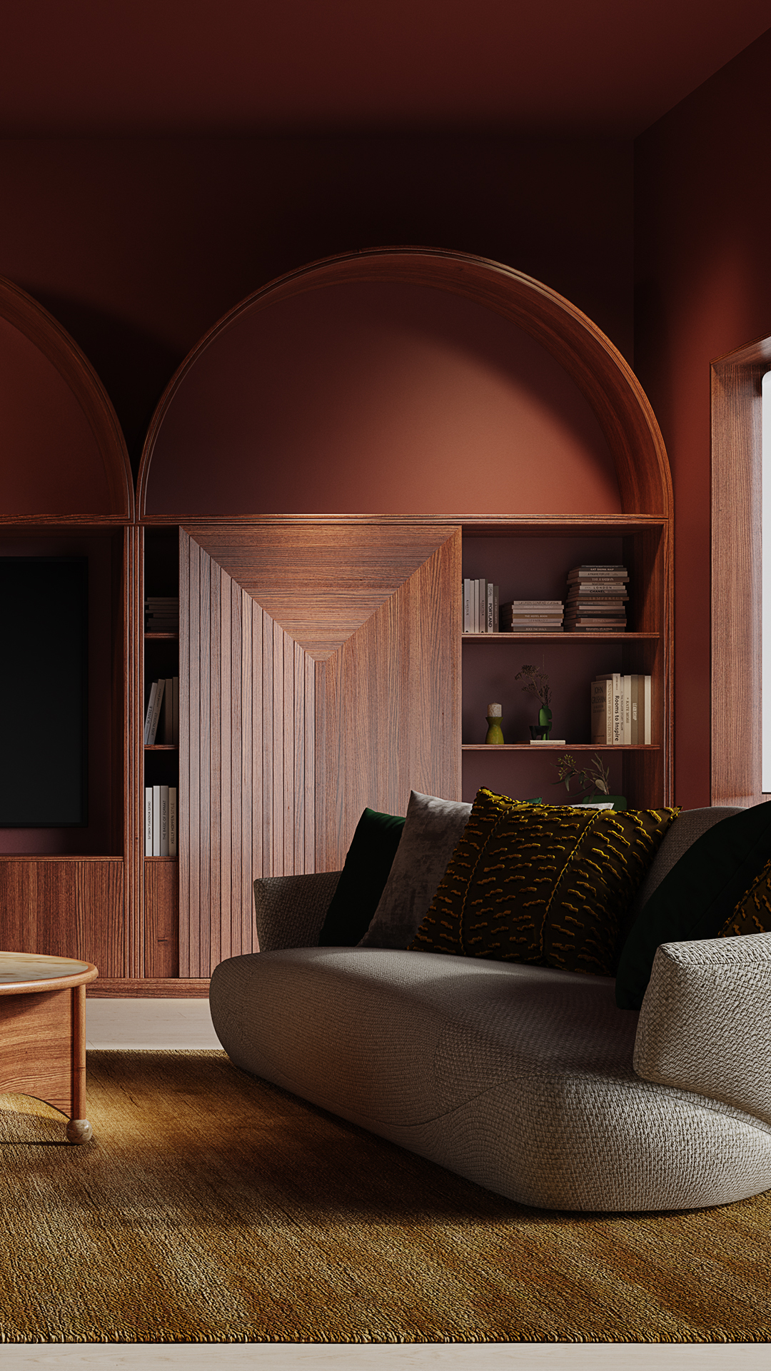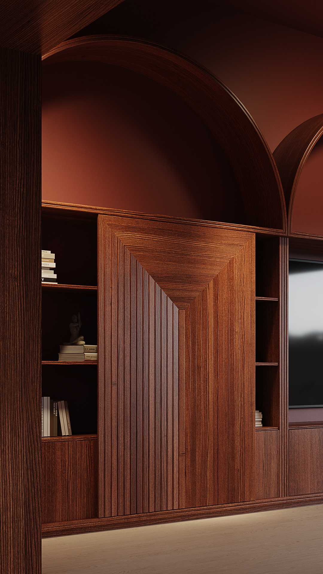 Я.М.: Стелаж мав не лише бути функціональним, але й вписатись у простір у класичному стилі, додати йому французського шарму — пом’якшити геометрію кесоновнаної стелі та прямі лінії в оздобленні вітальні. Так з’явилися пластичні арки. Стелаж став місцем, де зберігаються не лише книги, а й мистецтво — замовниця обожнює предмети українських митців та вінтажні речі з історією. У нижніх ящиках планувалось зберігати сімейні альбоми, а також іграшки маленької доньки, яка більшість часу проводить у вітальні.