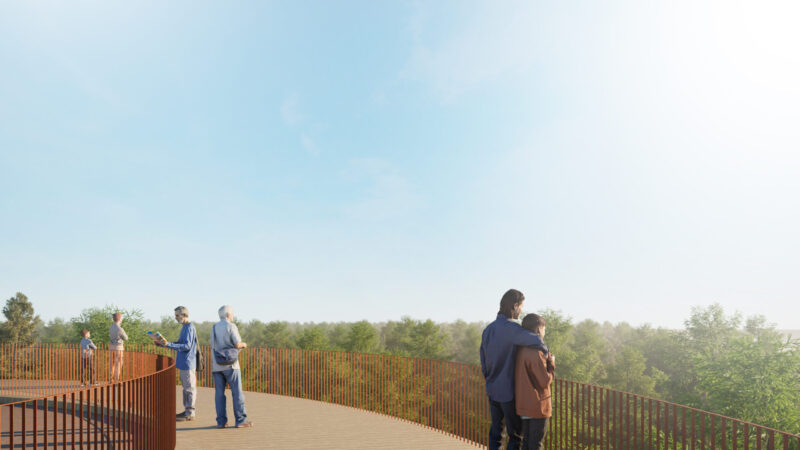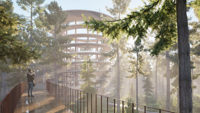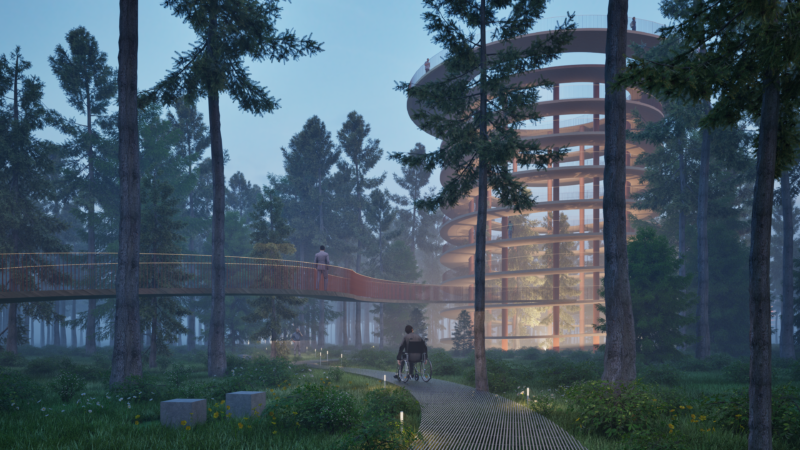 Деякі доріжки підіймаються до крон дерев, ведучи до центрального акценту комплексу – оглядової вежі, що вивіщується понад деревами та надає унікальну можливість побачити Київщину з висоти пташиного польоту. Вежа є повністю інклюзивною для всіх груп населення, адже її виконано за принципом спіралі з пандусами. До неї також можна піднятися за допомогою ліфта.