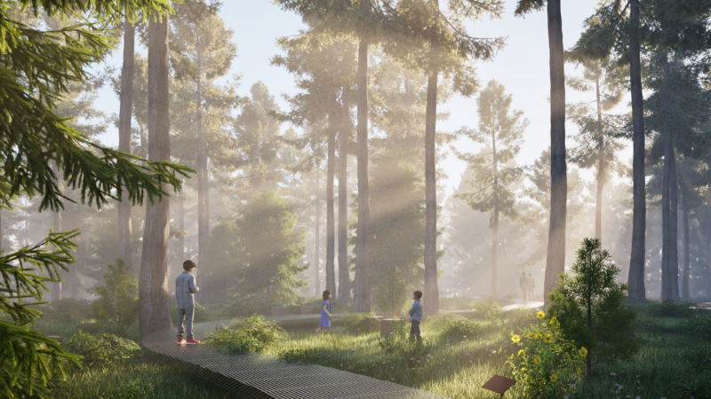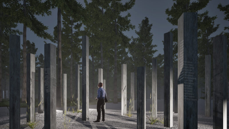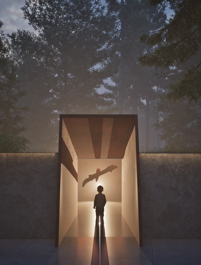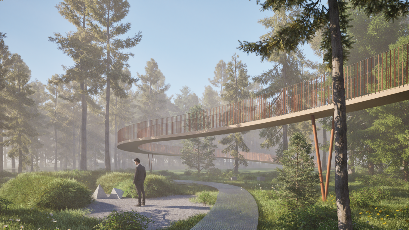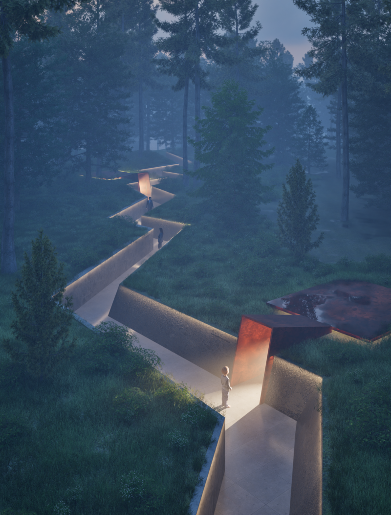 Проєкт створений студентом-архітектором Єгором Перепелюком з глибокою шаною до воїнів та історії. Рішення заохочує до роздумів і має глибокий зміст. Проєкт створює простір, де кожен відвідувач може відчути зв’язок із природою та знайти спокій. Через ліс проходять прогулянкові доріжки, зроблені з легкої сітчастої конструкції, яка не шкодить навколишньому середовищу.