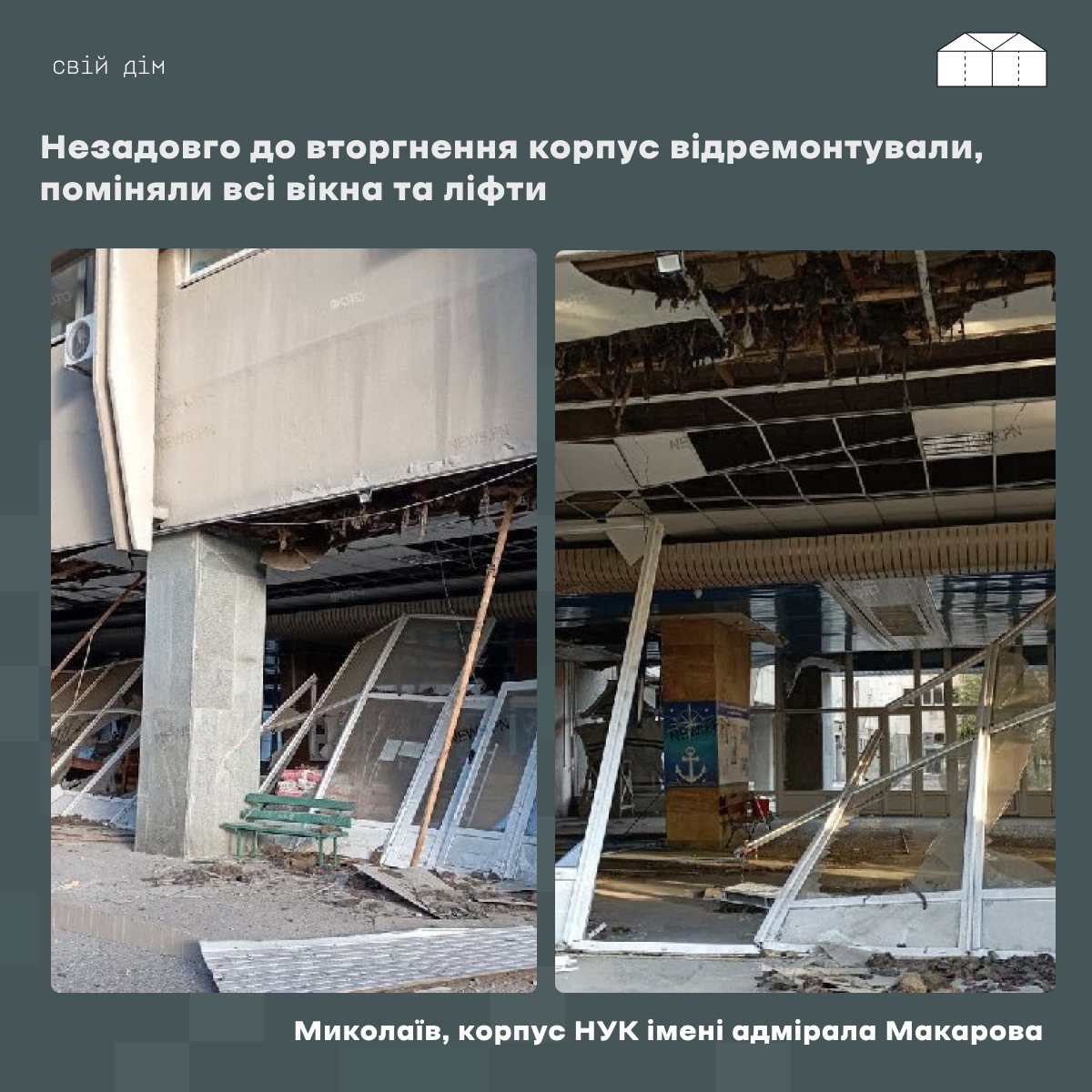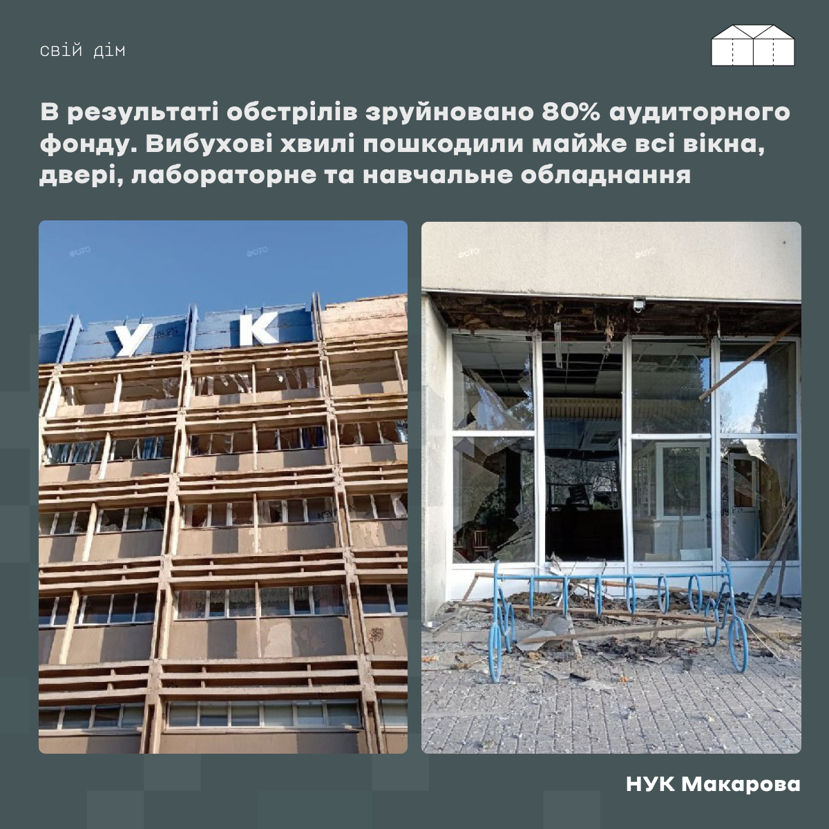 “Другий обстріл відбувся вночі, в той час в будівлі не було співробітників, тільки охорона. Але через те, що люди почули вибухи за межами університету, вони спустилися до підвалу і не постраждали”, — розповів журналісту “Свій дім” Михайло Михайлов, проректор з навчально-педагогічної роботи та міжнародної діяльності.