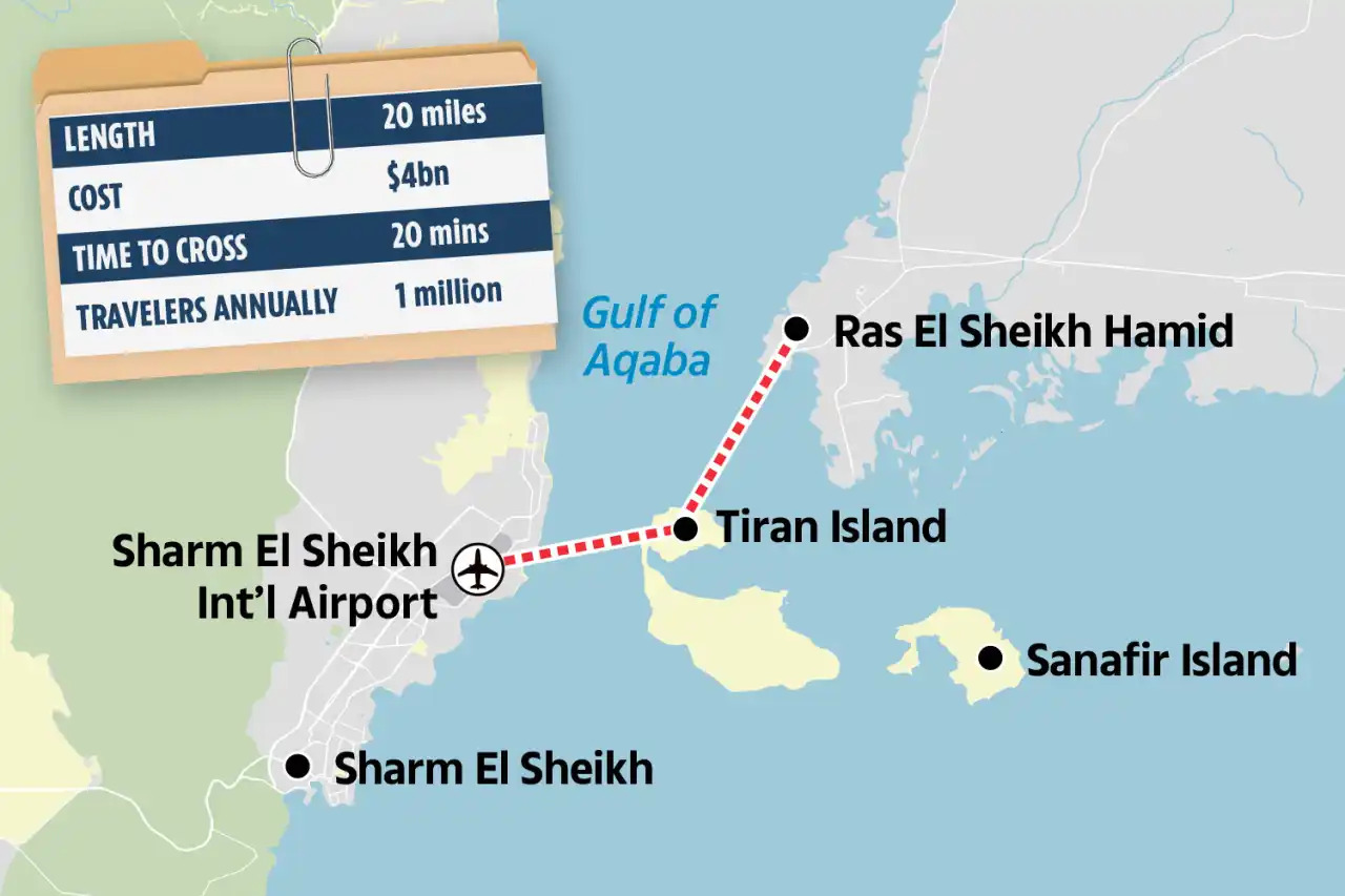 Запланований міст має з’єднати Рас-ель-Шейх-Хамід (Саудівська Аравія) та Шарм-еш-Шейх (Єгипет), проходячи через острів Тиран. Це не лише символічне, а й стратегічне з’єднання Африки та Азії, спрямоване на розвиток торгівлі та туризму.