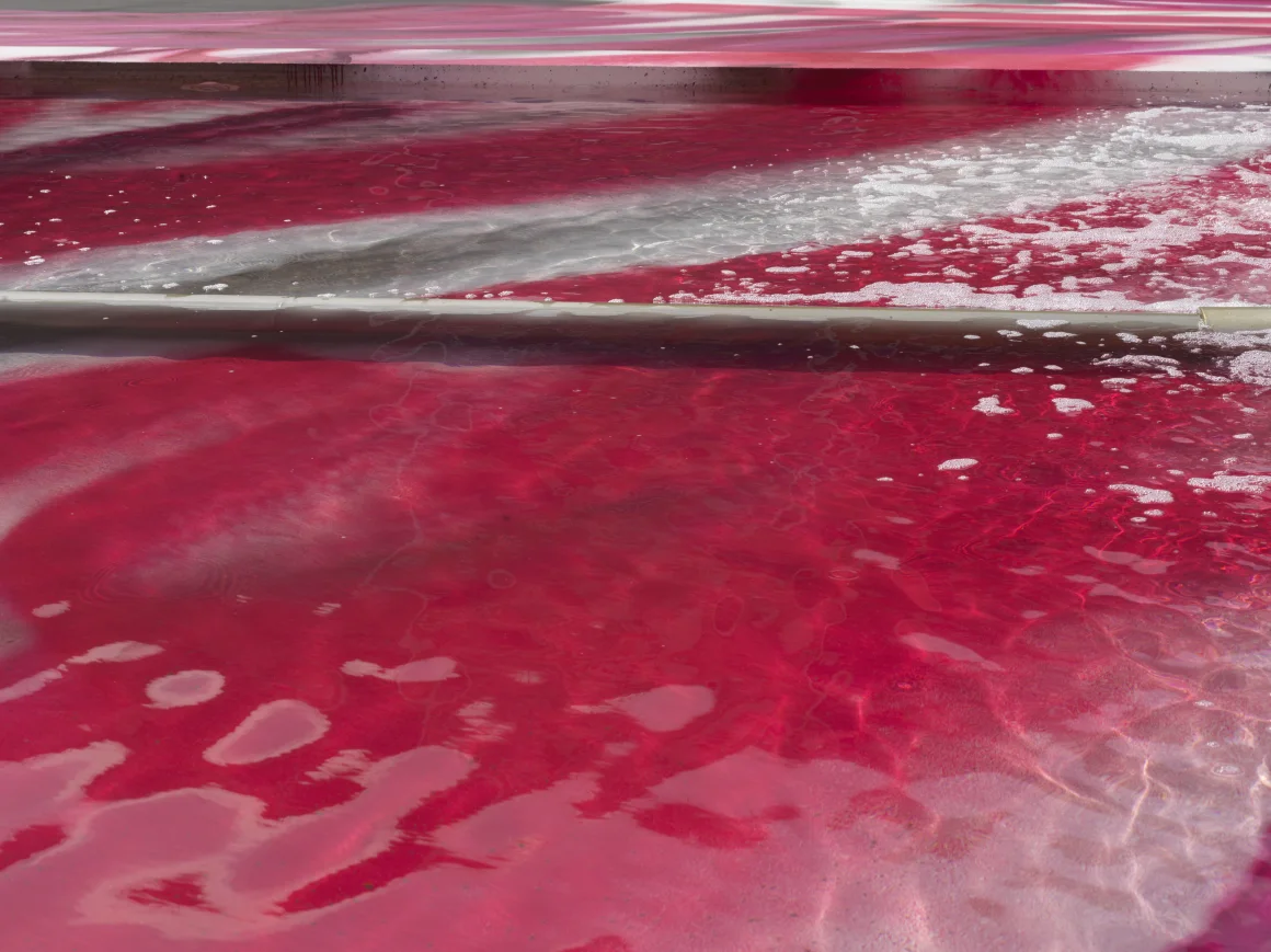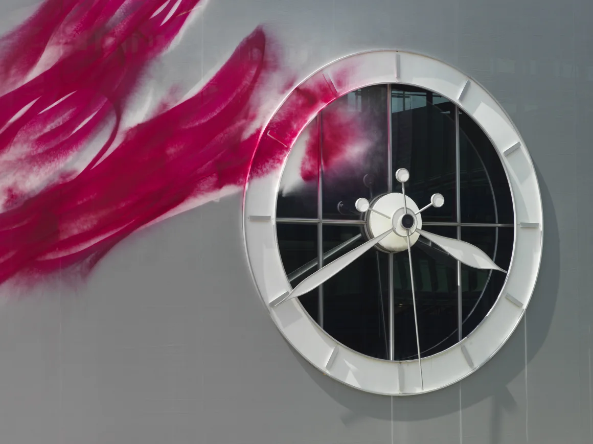 Фарба вкриває елементи площі, зокрема фонтан і великий годинник на фасаді одного з виставкових павільйонів. Фото: Jens Ziehe / Надано художницею / VG Bild-Kunst, Бонн, 2025