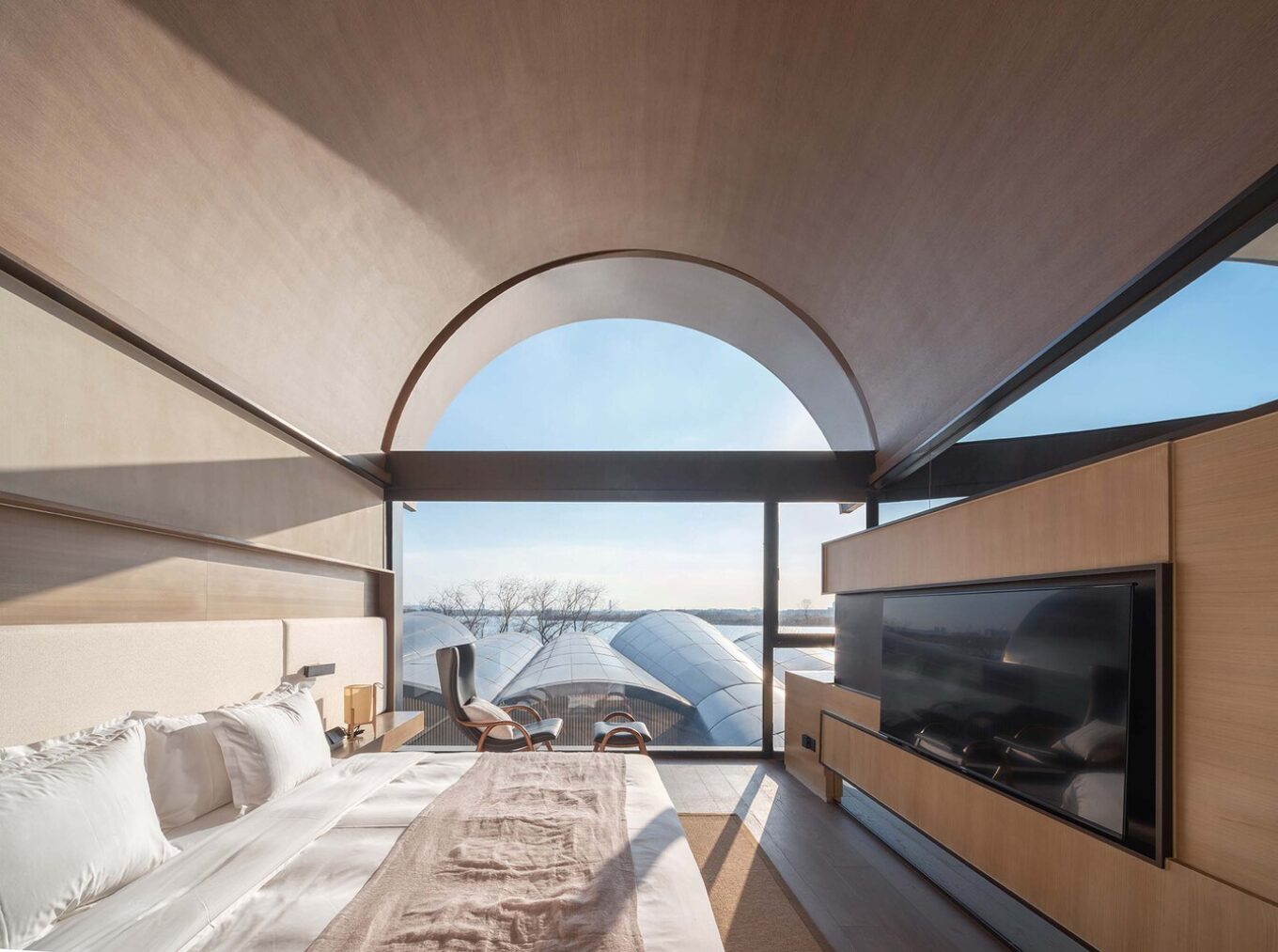 Готель Qushui Shanwan Boatyard складається з трьох окремих зон: стійки реєстрації, кафе та бару, а також номерів. Арка кожного номеру верхнього поверху плавно переходить в арку нижнього, що створює гармонійну єдність і цілісність готелю.