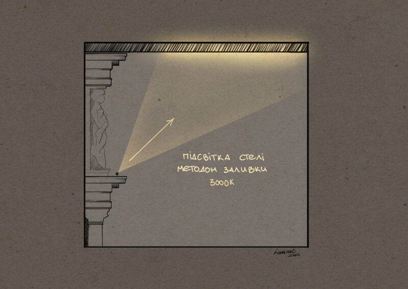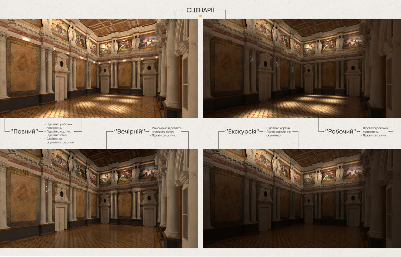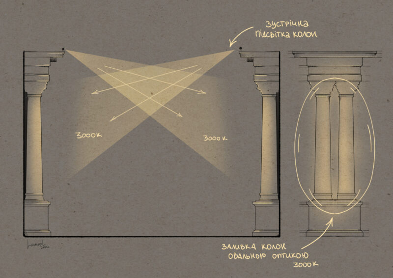 До проєкту долучився відомий реставратор Микола Бевз, який вже працював над відновленням зали. Він поділився візією архітектора Юліана Захаревича, це дозволило команді світлодизайнерів краще зрозуміти мистецьку й концептуальну ідею простору.