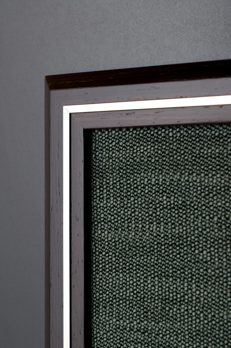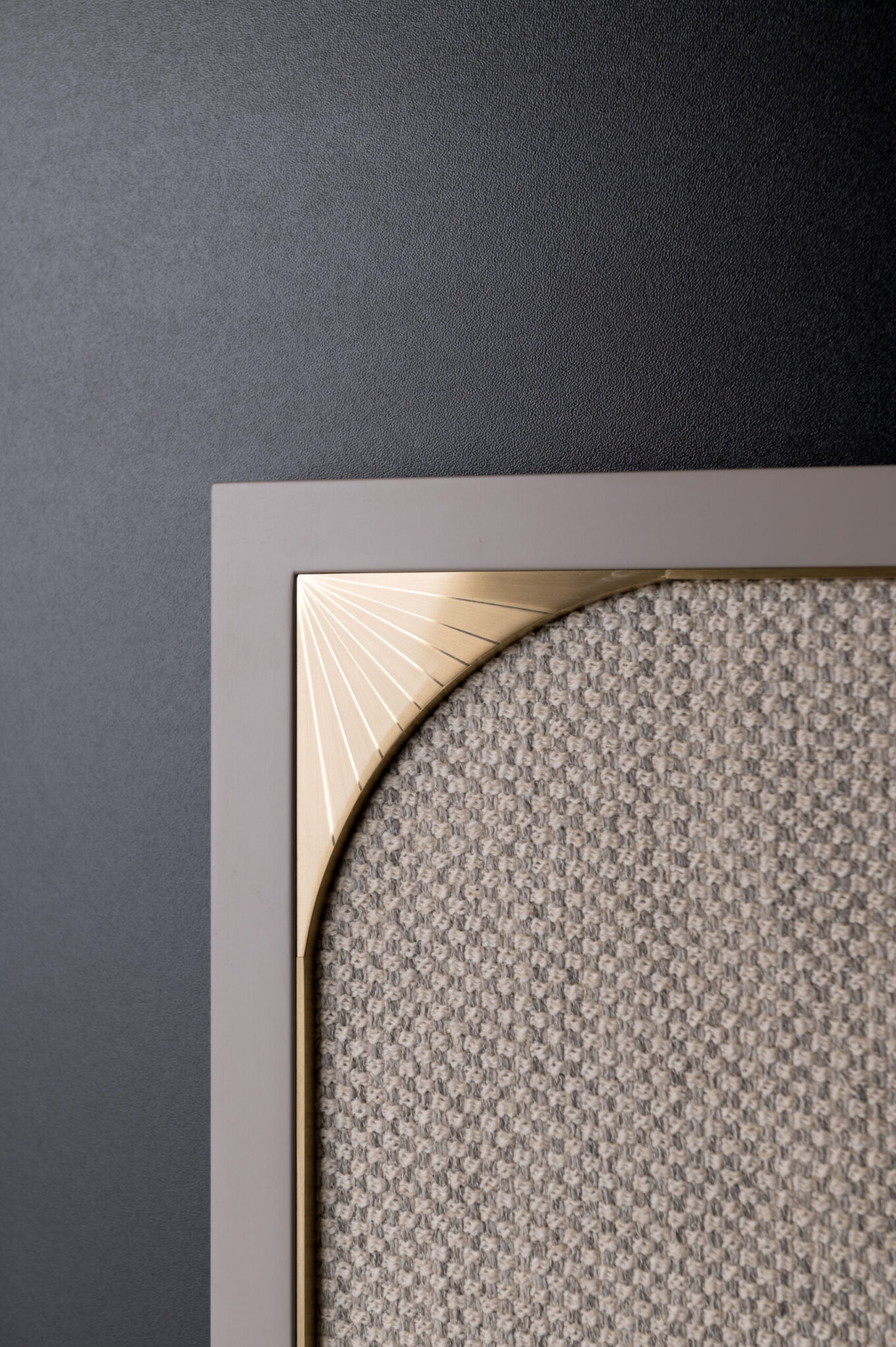 Внутрішня латунна рамка підкреслює унікальну фактуру тканини. Переливи світла на металевій поверхні створюють ефект глибини й динамізму, граючись із тінями та відблисками. У поєднанні з м’якою матерією та дерев’яною рамкою внутрішня латунна оздоба створює гармонійне поєднання всіх трьох матеріалів.