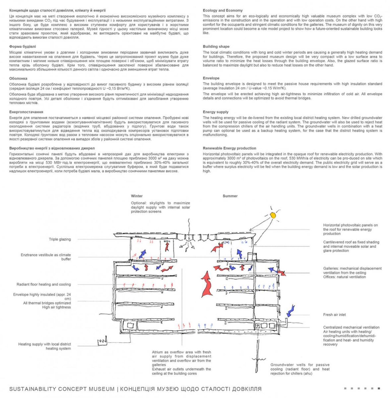 По словам авторов проекта-победителя, их концепция состоит в создании экологически и экономически высококачественного комплекса с низкими показателями выброса СО2, как во время строительства, так и во время эксплуатации. К пространствам комплекса выдвинуты жесткие климатические требования, выражающиеся в минимизации утраты тепла сквозь оболочку здания. Авторы заявляют, что площадь застекленной поверхности сбалансирована для максимального использования естественного освещения и снижения теплопотерь. Проект предусматривает встроенные в непрозрачную кровлю горизонтальные солнечные панели площадью 3 000 кв. м., что позволит генерировать порядка 530 МВт в год (30-40% потребности здания).