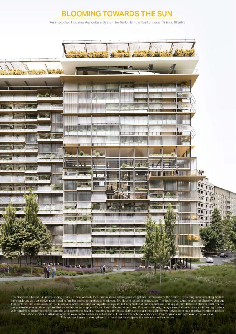Друге місце посів проєкт студїї Zigeng Wang II “Квітучість назустріч сонцю” від Китаю. Концепція архітекторів пропонує відновлювати об’єм будівель за рахунок розширення житла новими фасадами, а балкони облаштовувати з максимальним озелененням.
