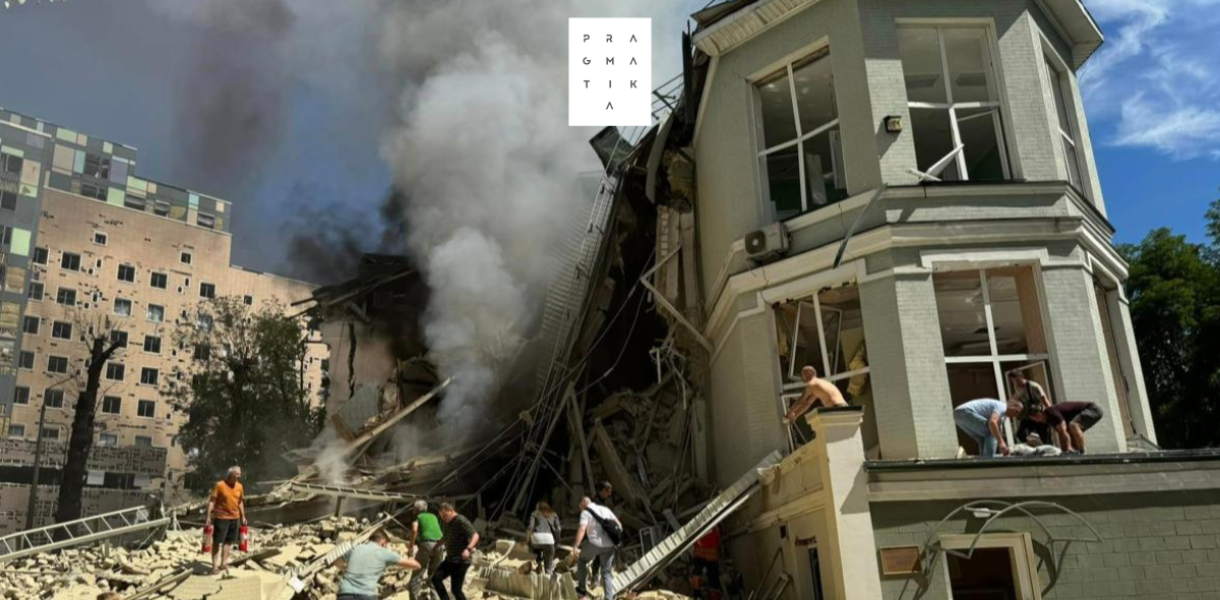 Одну з будівель дитячої лікарні “Охмадит” майже повністю знищено внаслідок російської атаки 8 липня. Будівлі поруч також постраждали.