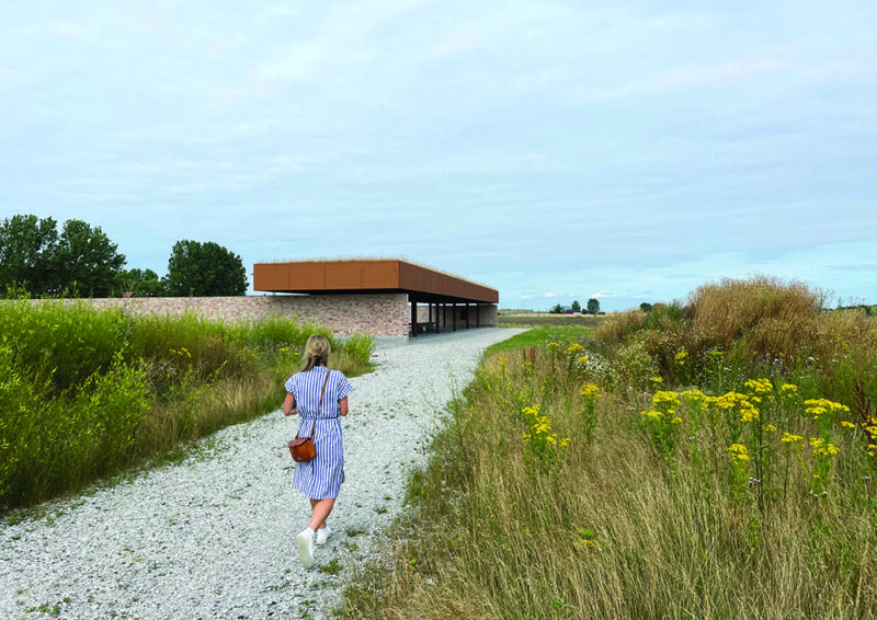 Стіну, яка огороджує простір від поля, звели з 48 тисяч цеглинок, які зберегли після знесення фабрики варення Bjoernekulla. Проєкт розробила студія Brendeland & Kristoffersen Architects з Осло.