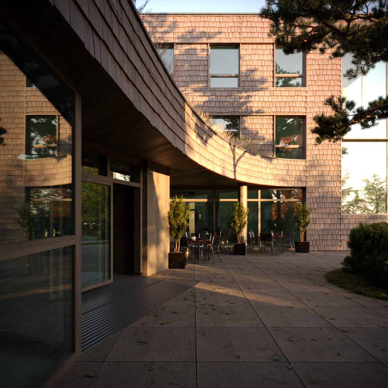Перед новим головним входом у заклад організована зона посадки/висадки пасажирів. Тут же пропонується облаштувати невеликий велопаркінг.
