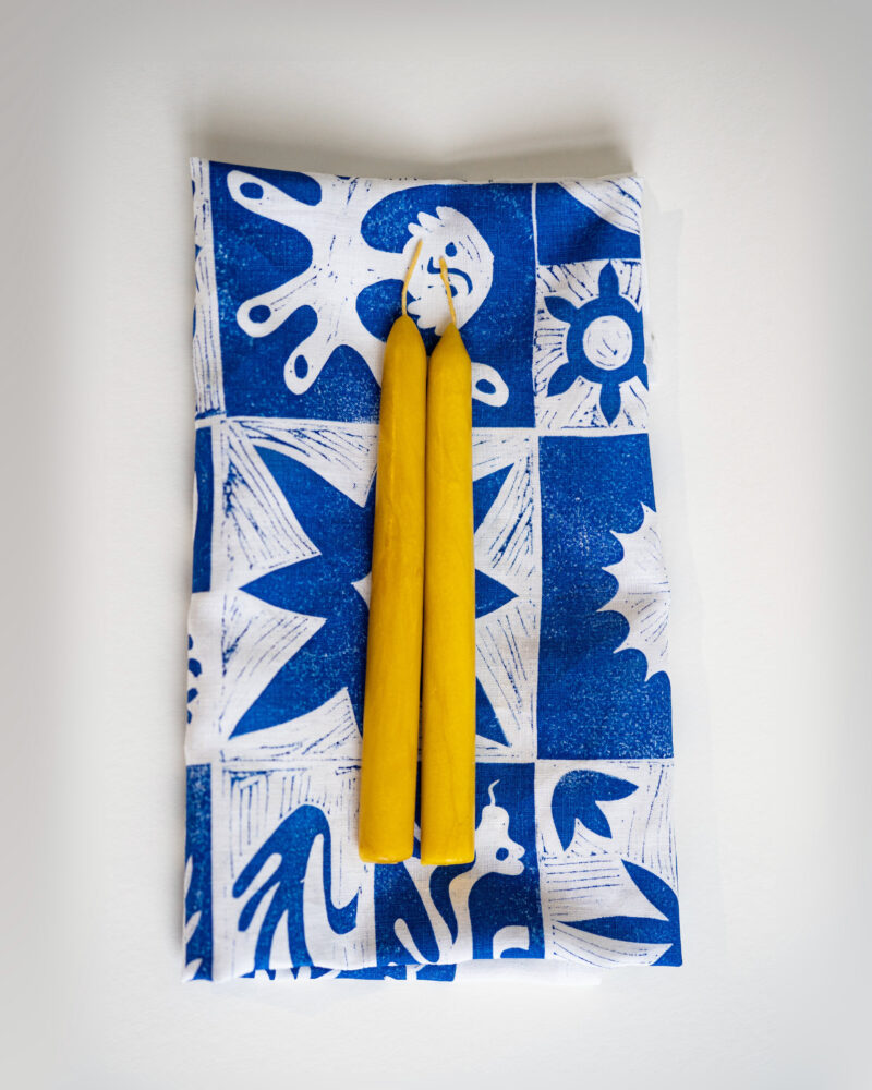 Малюнки синьою фарбою нанесені на вироби у техніці ручної вибійки.