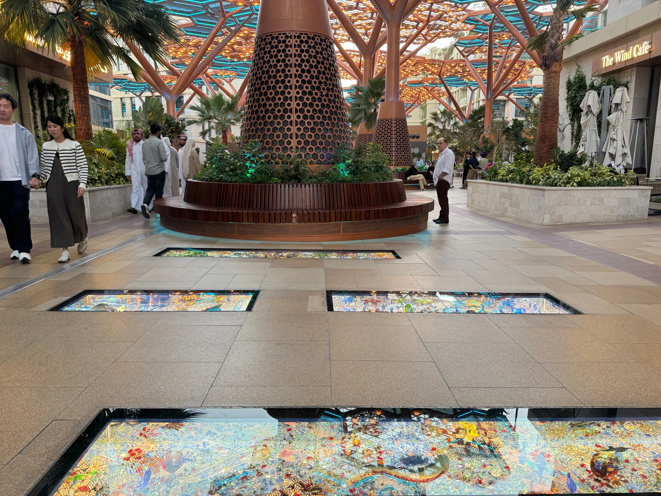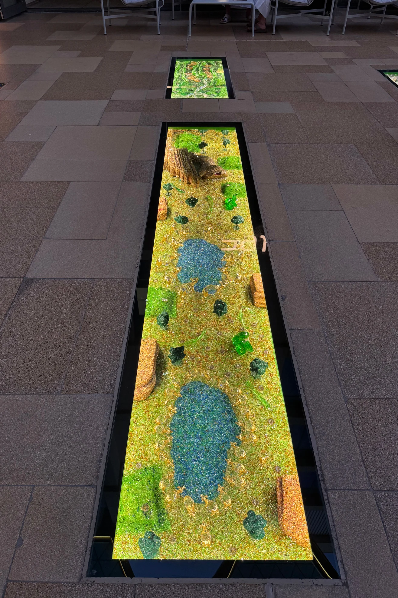 У підлогу променаду вмонтовано близько 180 прямокутних кристалічних панелей під міцним склом. Усередині розташовані мініатюрні композиції, що зображують пустелі, сніжні пейзажі, ліси, моря, міста, промислові сцени, косяки риб, крокодилів, колонії пінгвінів і навіть каравани верблюдів.