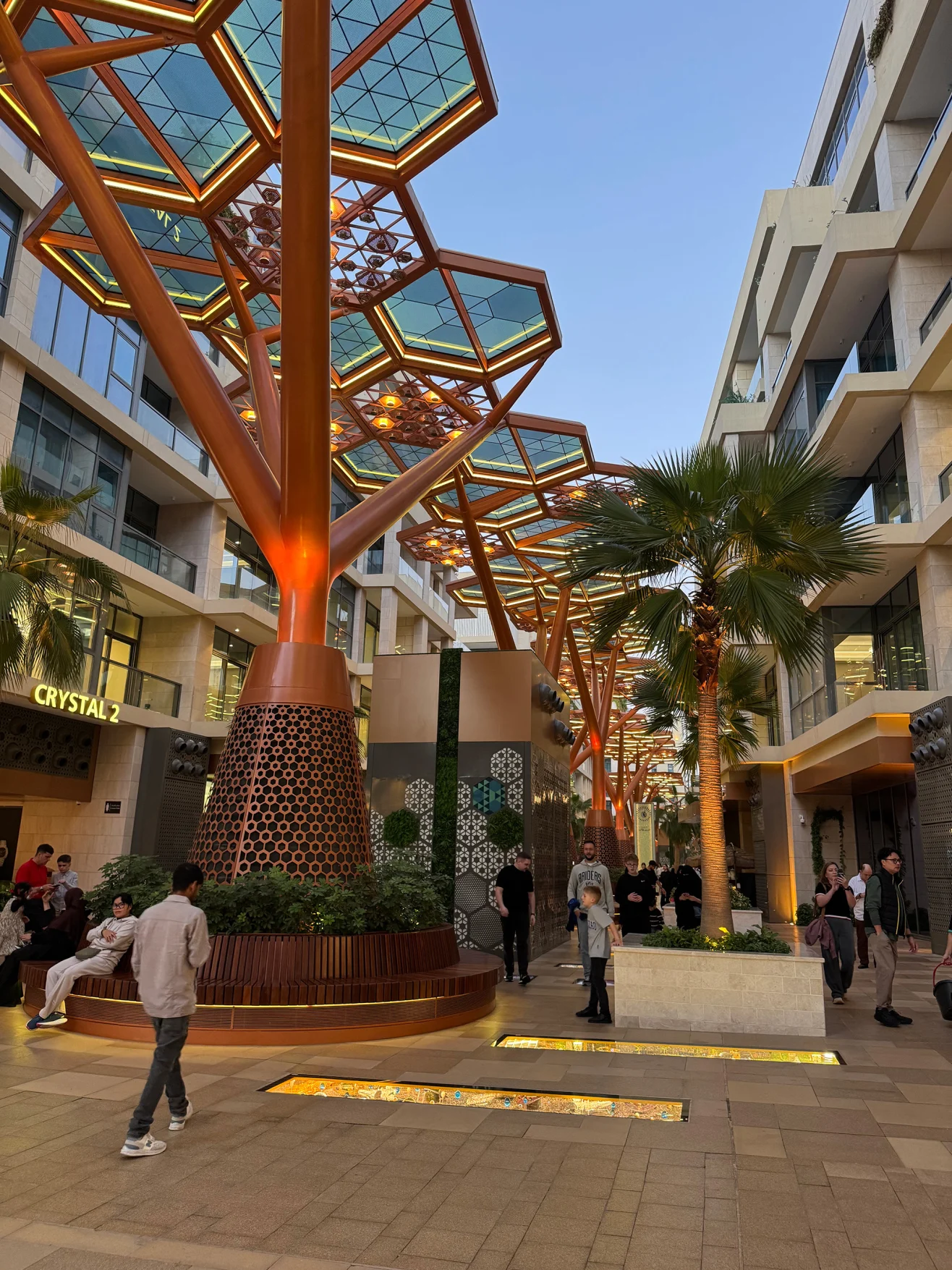 Конструкції у формі дерев із кристалічними навісами пом’якшують сліпуче сонячне світло та допомагають утримувати охолоджене повітря, що подається знизу, підтримуючи стабільну температуру на Crystal Walk навіть улітку. Фото: Ulrike Lemmin-Woolfrey