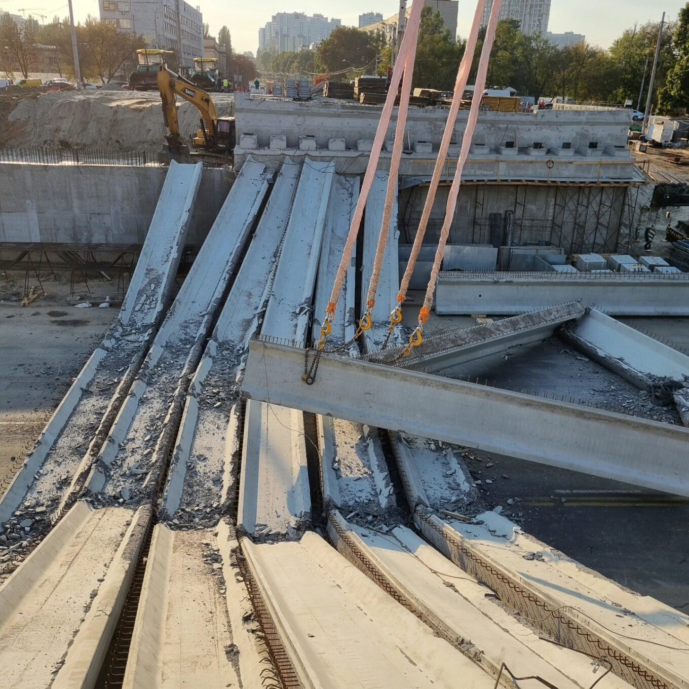 Як зазначають у КМДА, 30 вересня під час монтажу сьомої балки прогонової будови мосту вона втратила свою стійкість і впала на інші встановлені поруч балки. Це призвело до порушення їх стійкості та пошкодження решти шести балок прогонової частини.