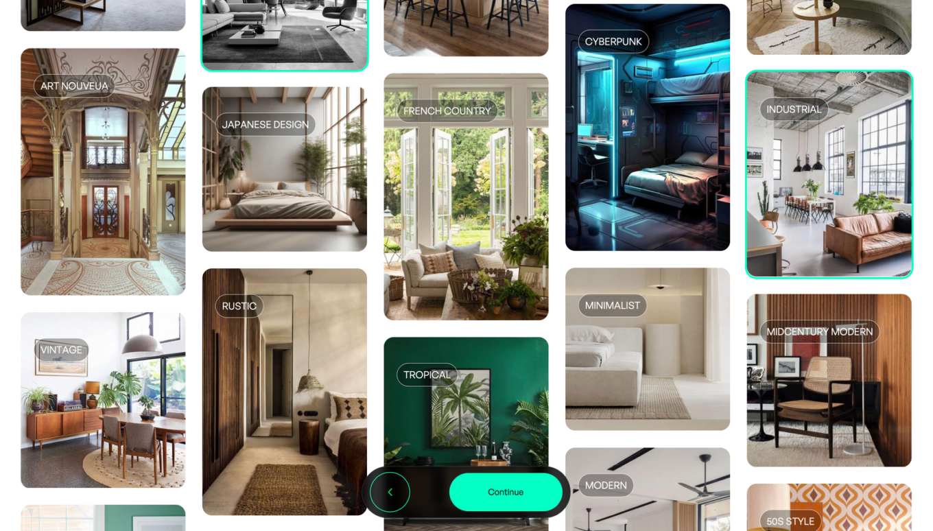 Далі оберіть стиль у якому буде розроблено майбутній дизайн. Починаючи з мінімалістичного, скандинавського, артдеко та неокласики, закінчуючи кіберпанком, барбі та дизайном у стилі відомого фестивалю “Burning Man”.