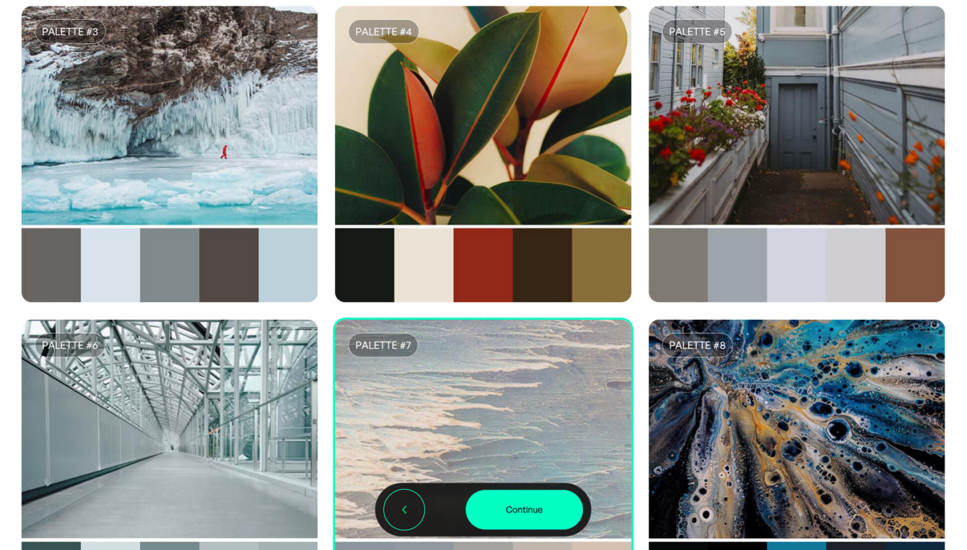Перейдіть до наступного кроку. Тут необхідно обрати кольорову палітру вашого приміщення. Програма надасть приклади у вигляді картинок з виокремленими кольоровими палітрами. Виберіть одну з них, орієнтуючись виключно на ваші кольорові уподобання.
