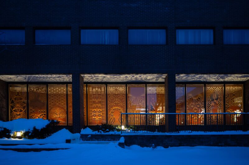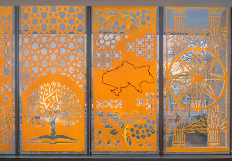 Загальна площа вирізаних паперових полотен становить 36,6 м². Традиційна українська техніка витинанки, відома з XIX століття як елемент домашнього декору, у проєкті набуває урбаністичного масштабу. Тепло-жовтий папір створює ілюзію внутрішнього світла: вдень вікна сприймаються як світлові площини, а вночі композиції розкриваються через складну графіку тіней.