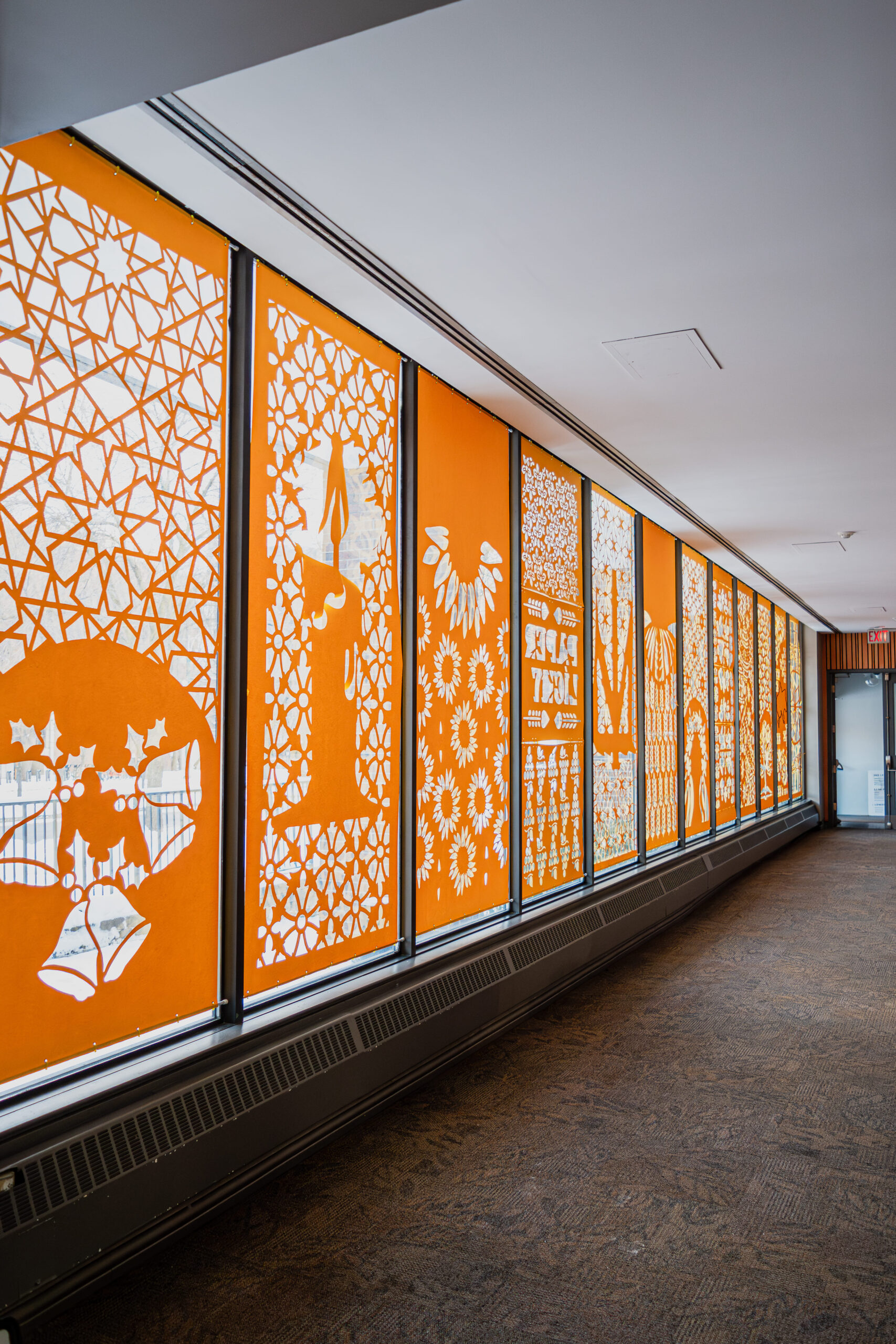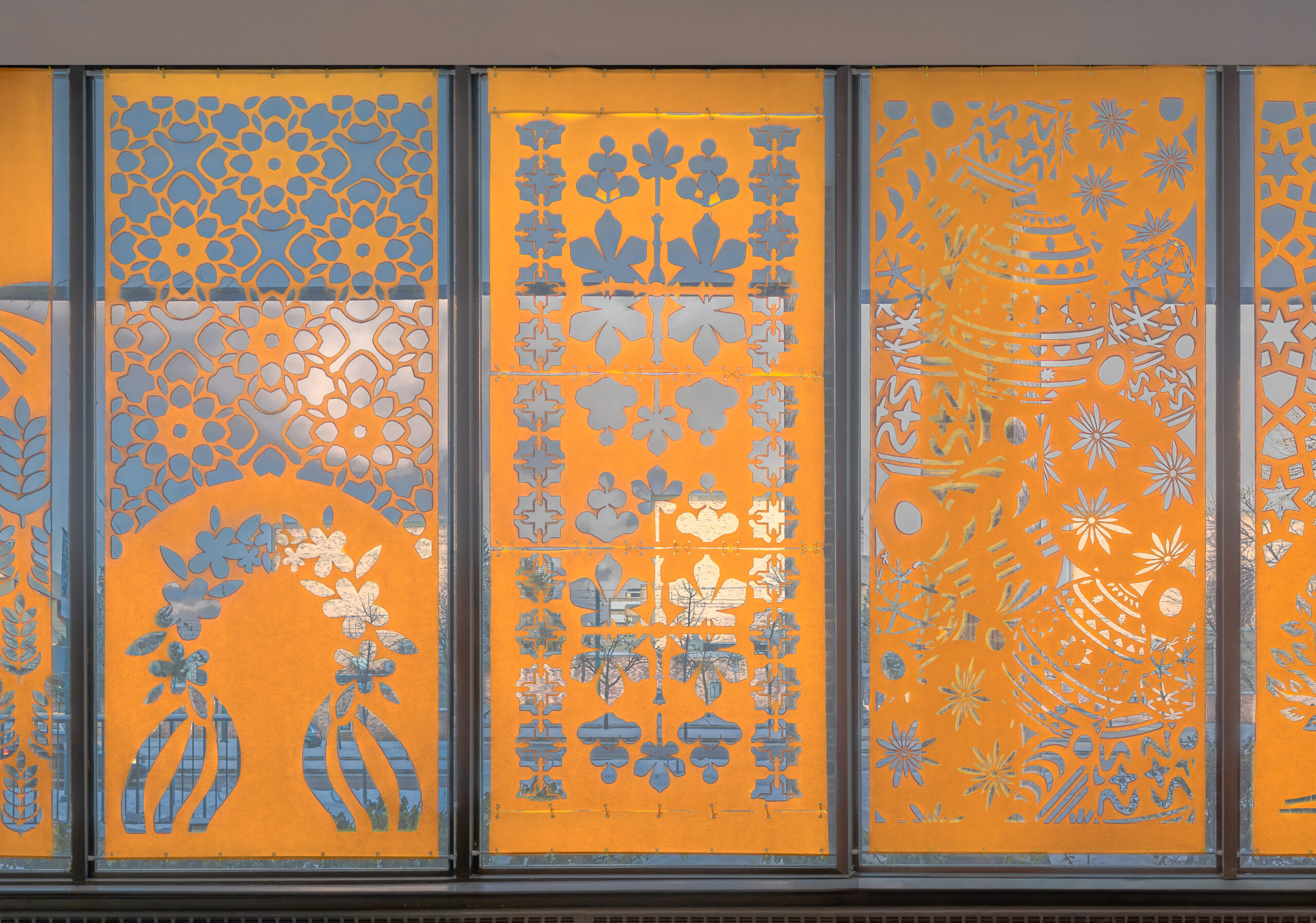 Загальна площа вирізаних паперових полотен становить 36,6 м². Традиційна українська техніка витинанки, відома з XIX століття як елемент домашнього декору, у проєкті набуває урбаністичного масштабу. Тепло-жовтий папір створює ілюзію внутрішнього світла: вдень вікна сприймаються як світлові площини, а вночі композиції розкриваються через складну графіку тіней.