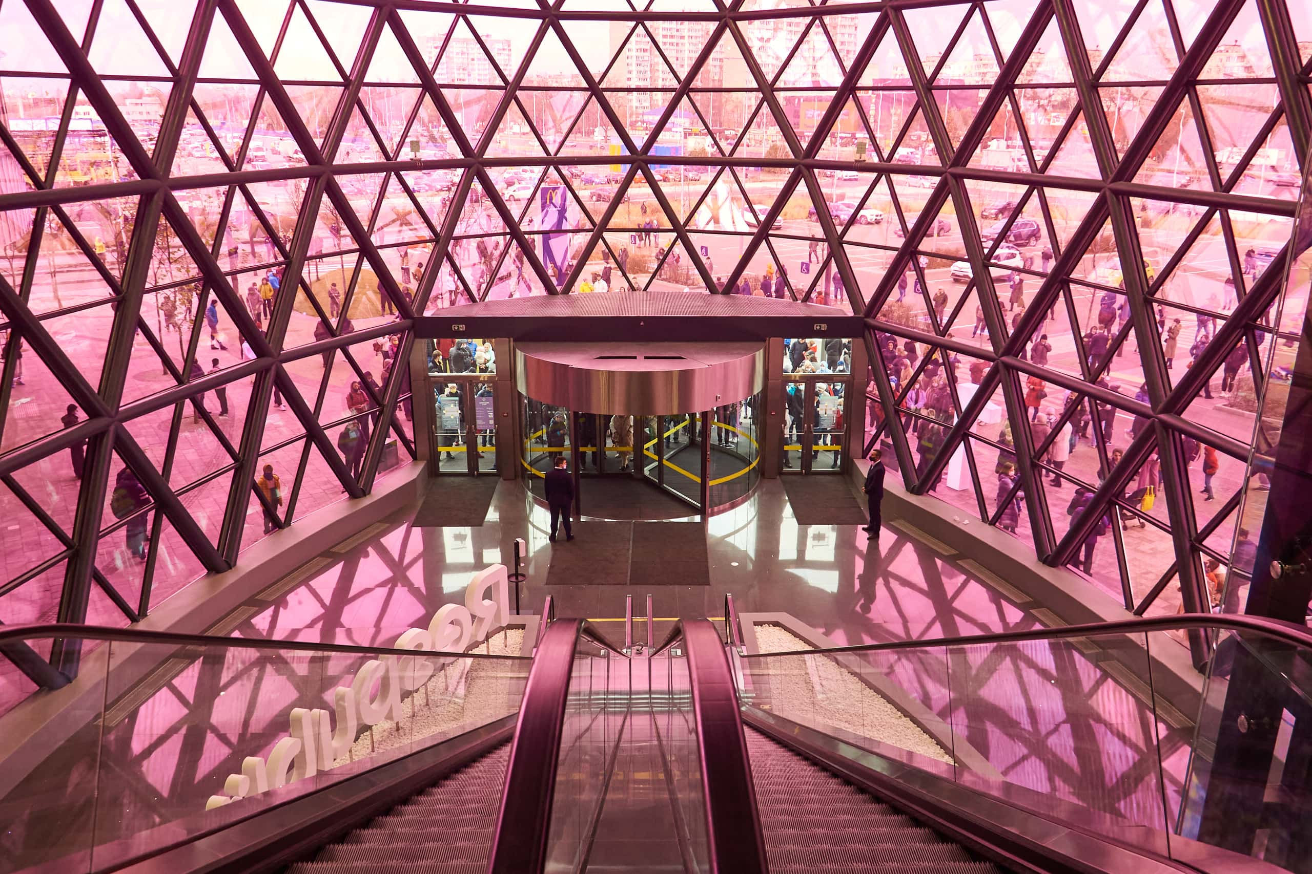 Самый необычный архитектурный элемент комплекса – атриум. Он представляет собой огромное пространство высотой около ста метров, накрытое семидесятиметровым светопрозрачным куполом. Огибают его симметрично расположенные галереи криволинейной формы.