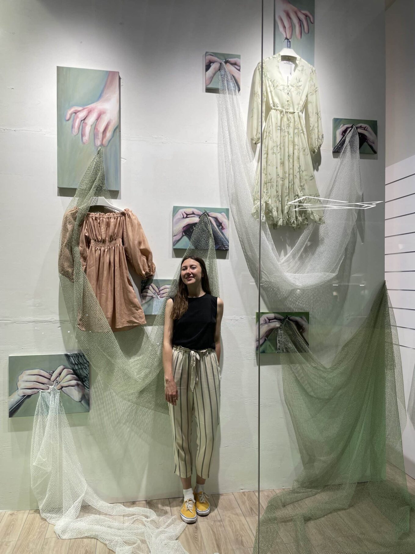 Марина Константинова, дизайнер вітражів, художник-декоратор у Київському академічному театрі драми та комедії на лівому березі Дніпра: «Краса у простоті» — це сентенція великих дизайнерів та художників. Та чи завжди ми пам’ятаємо про тих, хто створює цю простоту? Вітрина «Невидимі» — це історія про тих, хто є складовою частинкою твоєї сукні, луку та гардероба. Це всі ті невидимі руки, що зібрали матеріали, зіткали тканину, зробили принт, крій, фасон, і, нарешті, сам виріб.