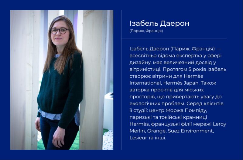 «Дизайн вітрин для мене — це наче лабораторія, дуже цікава сфера для вивчення того, як декоратор може вплинути на суспільний простір. Вітрина — історія, яка пропонується для всіх, ти ніколи не знаєш, хто може стати її глядачем. В тому й полягає особлива цікавість завдання вітриніста — створювати такі історії. Я щаслива, що в Україні відбувся такий конкурс, адже навіть у Франції вітриністика не є дуже знаною сферою для молодих декораторів. Одночасна робота над простором, ідеєю, кольором, матеріалами, графікою — справді непросте завдання навіть для професіонала. Я впевнена, що популяризація мистецтва декорування вітрин дуже важлива, адже саме завдяки йому певним чином і відбувається формування естетичних поглядів та смаку широкої публіки.