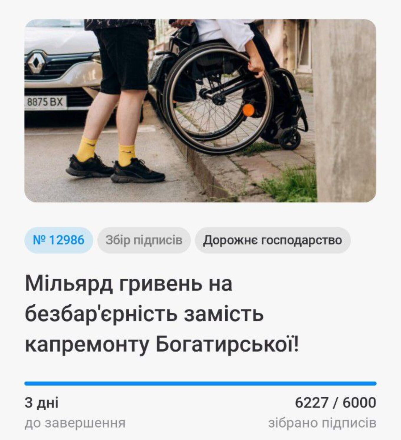 Петицію про необхідність “перекинути” гроші з ремонту вул. Богатирської у Оболонському районі Києва на створення безбар’єрного середовища зареєстрували напочатку травня на сайті Київської міськради.