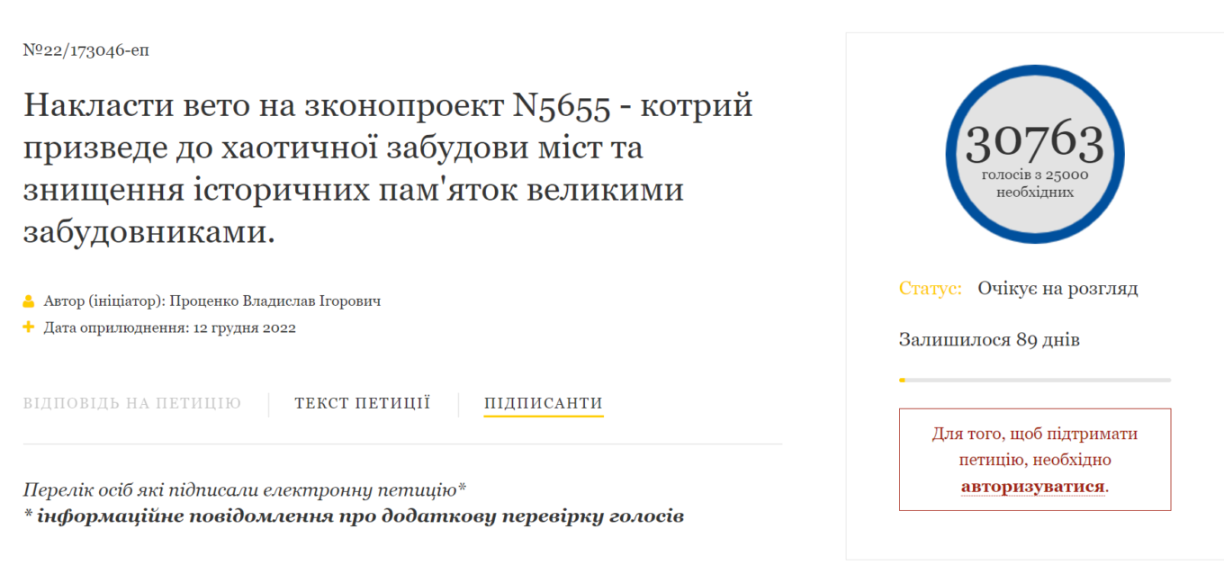 Перевірки будівництв і документації за цим проектом можуть бути здійснені приватними фірмами, а роль головних архітекторів міст у цьому процесі значно обмежується. Окрім цього пропонується створити “Містобудівну палату” при Міністерстві розвитку регіонів, повноваження якої дуже схожі з сумнозвісною “Тендерною Палатою””, – наголошується в тексті петиції.