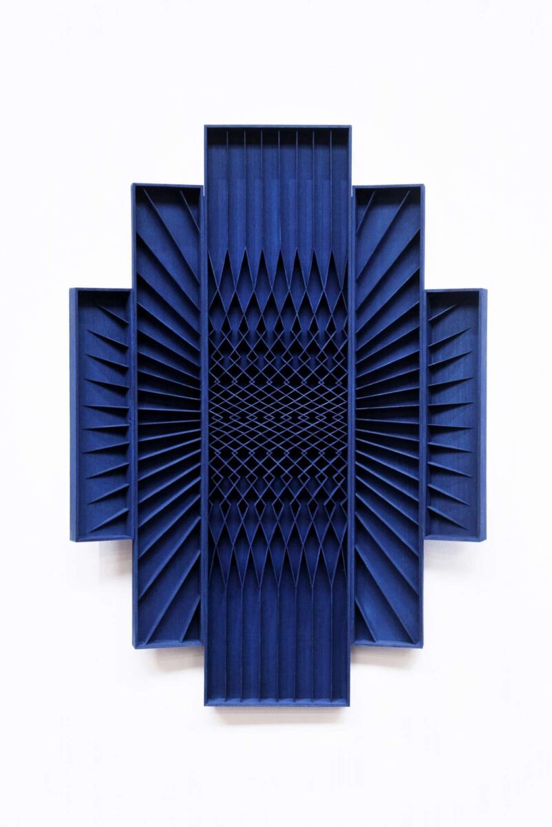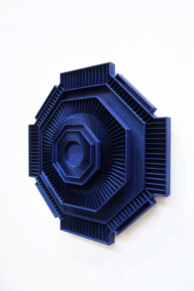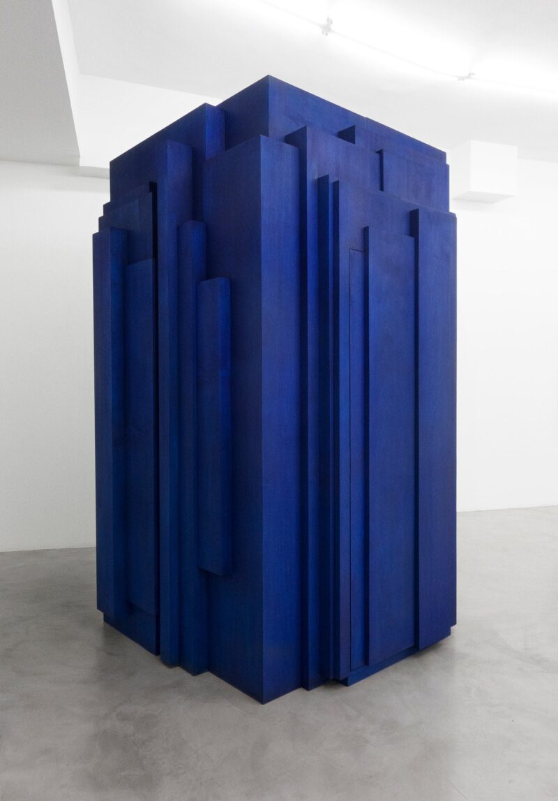 В экспозицию также входят рисунки углем и скульптуры – «объекты для почитания». Объекты из фанеры, окрашенной в кобальт, своими строгими симметричными формами, ритмическими рядами, орнаментами – неуловимо напоминают реликвии самых разных религий.