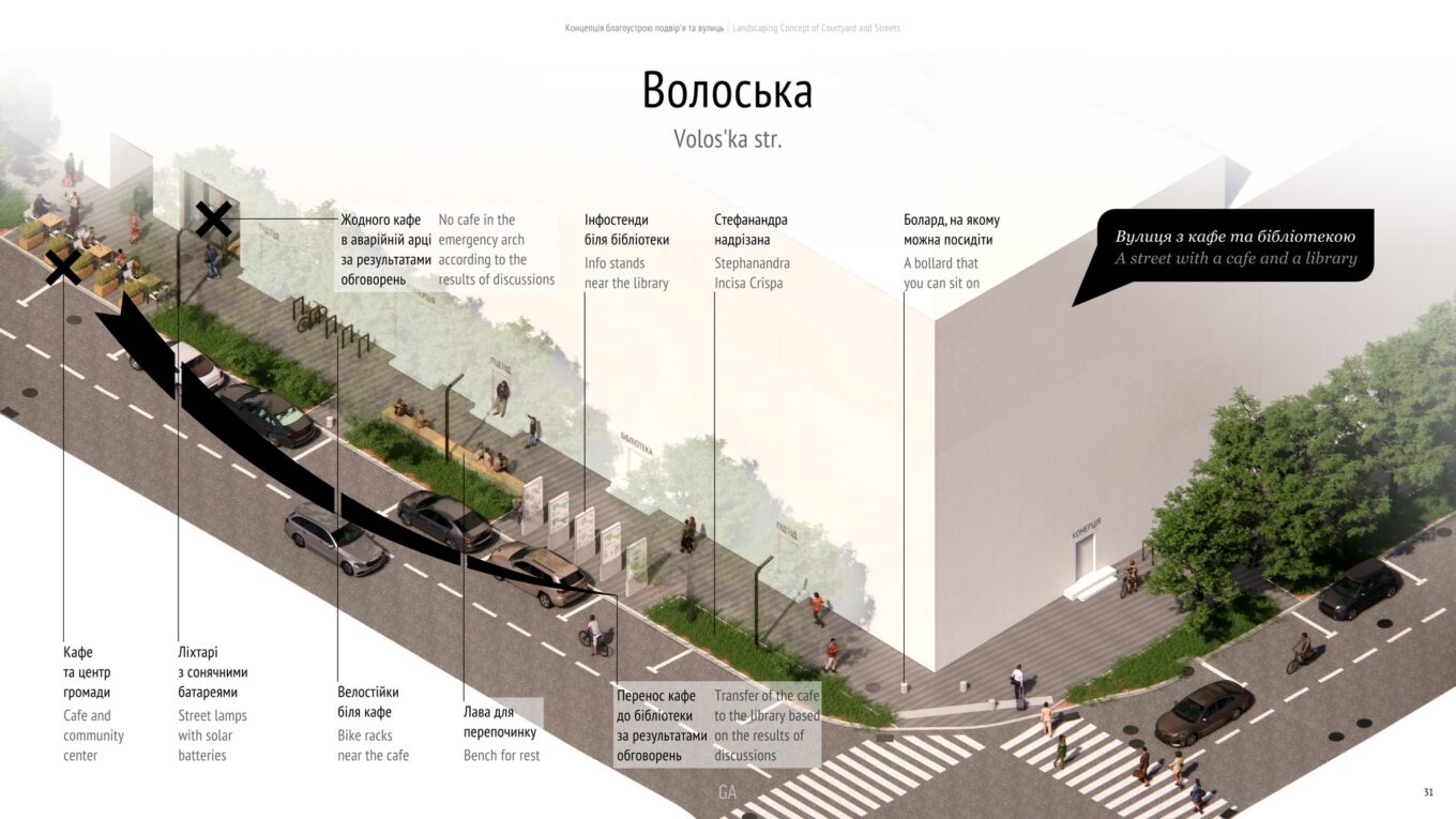 Зокрема, йдеться про план розвитку дворового простору за адресами: вул. Волоська 27, 29, 29А, 33, 34, вул. Ярославська 28А, 28Б, 32, 32/33, 32А, вул. Нижній Вал 39, 41 та вуличної зони на перетині вул. Ярославської та Волоської.