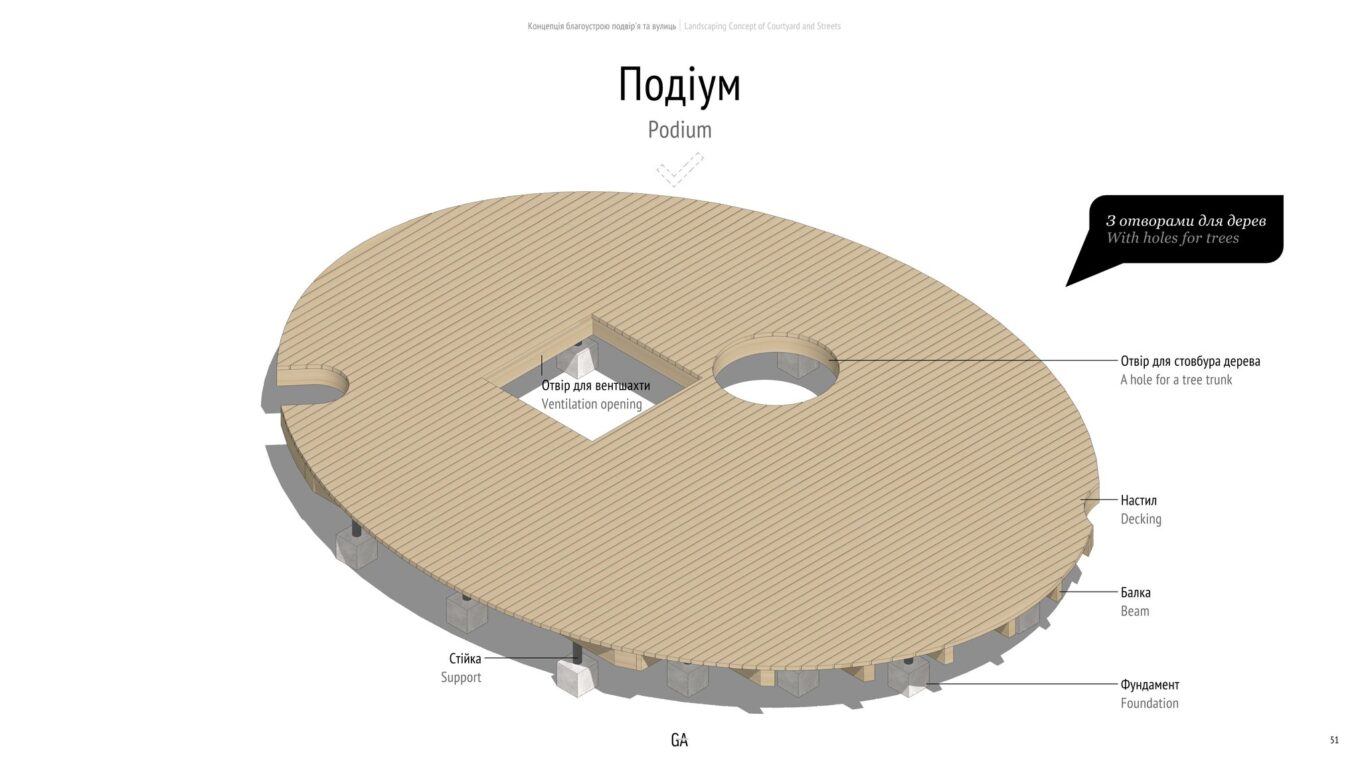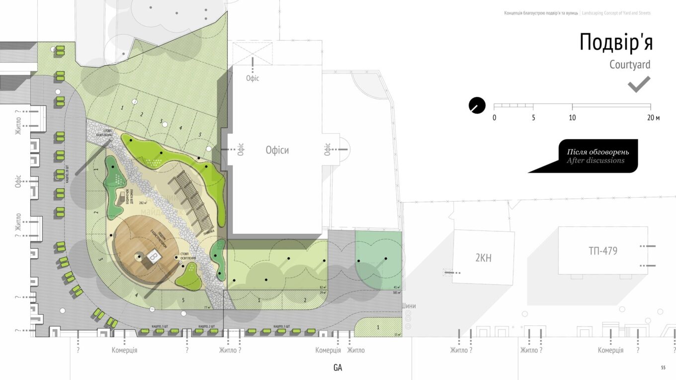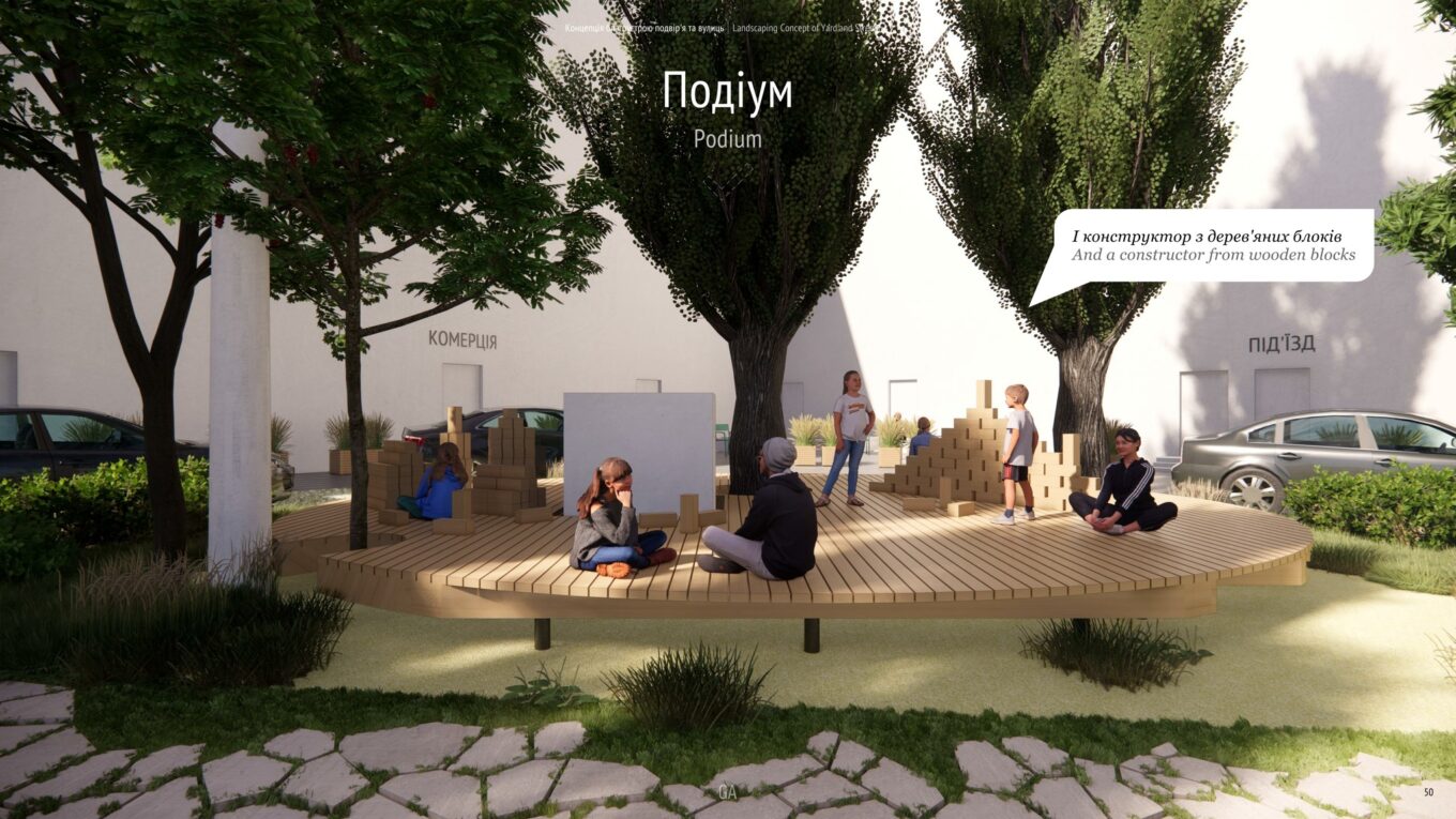 У внутрішньому дворі розробники концепції запропонували облаштувати дитячий майданчик, висадити рослинність, а замість лав – встановити подіум як місце для відпочинку. На подіумі хочуть залишити дерев’яні блоки, якими можна буде гратися, як конструктором.