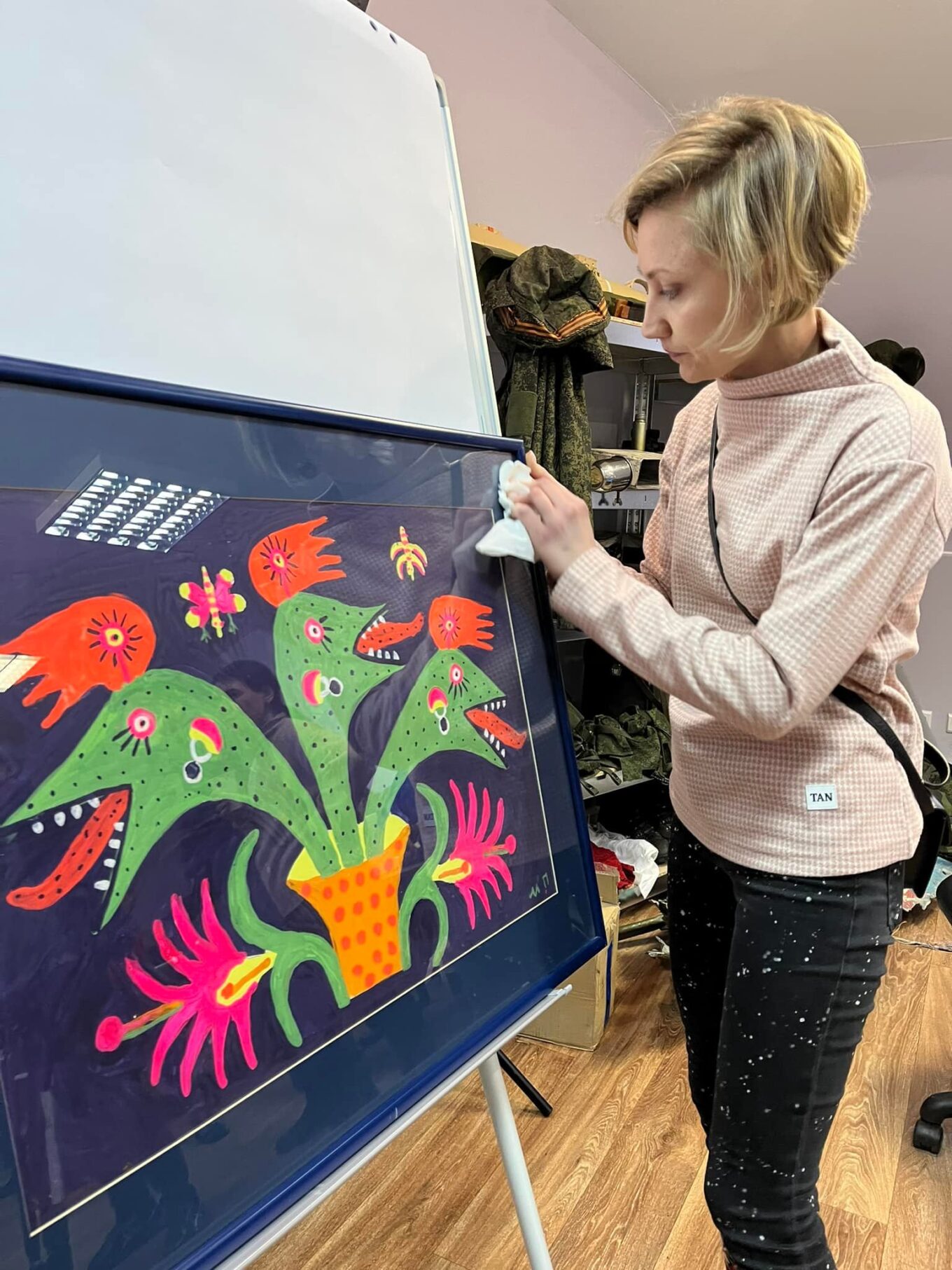 Дар’я Добріян у волонтерському штабі Сергія Притули з картиною “Квіти виросли біля 4-го блоку”. Фото: Maria Pysarenko