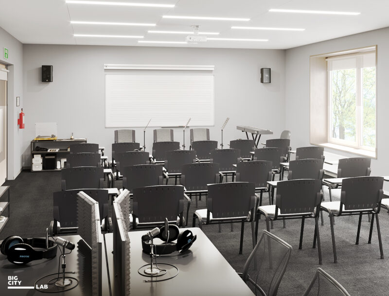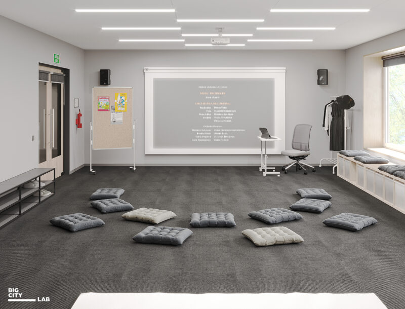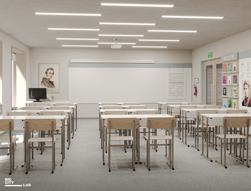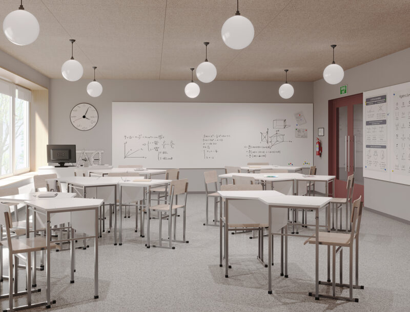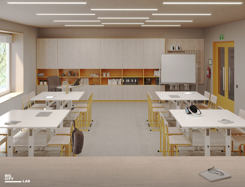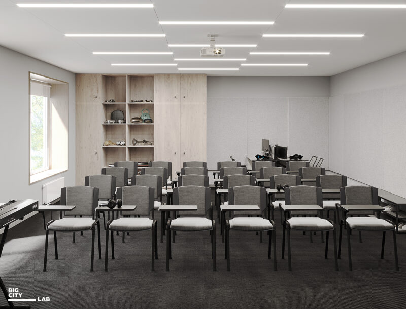 Для теоретичних навчальних кабінетів обрали світлі нейтральні кольори: теплий білий, пісочний, оливковий, світле дерево. Бо це класи щоденної навчальної практики, тому простір має бути спокійним і нейтральним, не домінувати, а підтримувати концентрацію.
